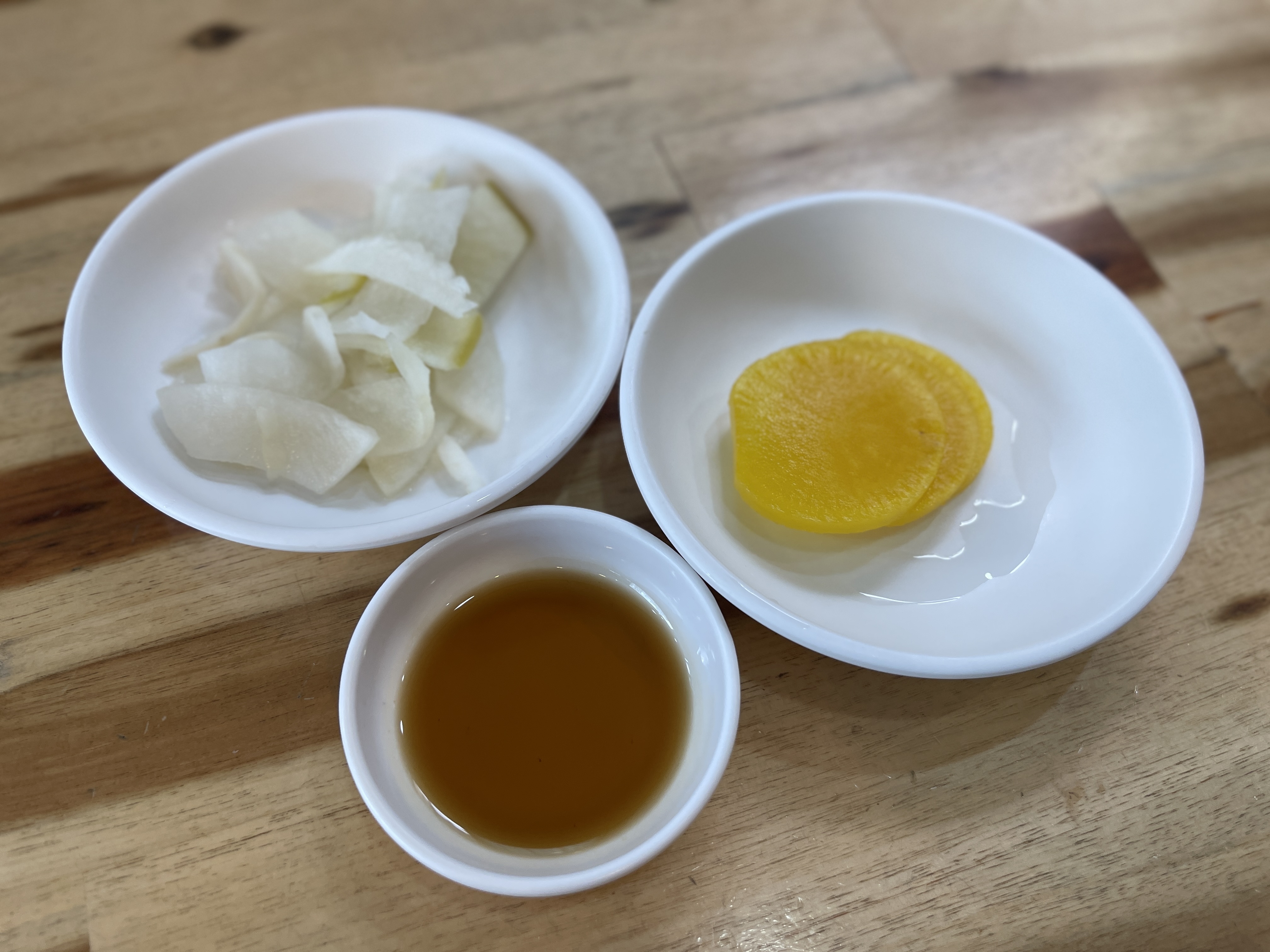 밀면맛집에 휘황찬란한 반찬이 굳이 필요있으랴.. 절임무와 만두랑 어울릴 단무지 그리고 맛간장이 전부다. 이정도면 족하다!