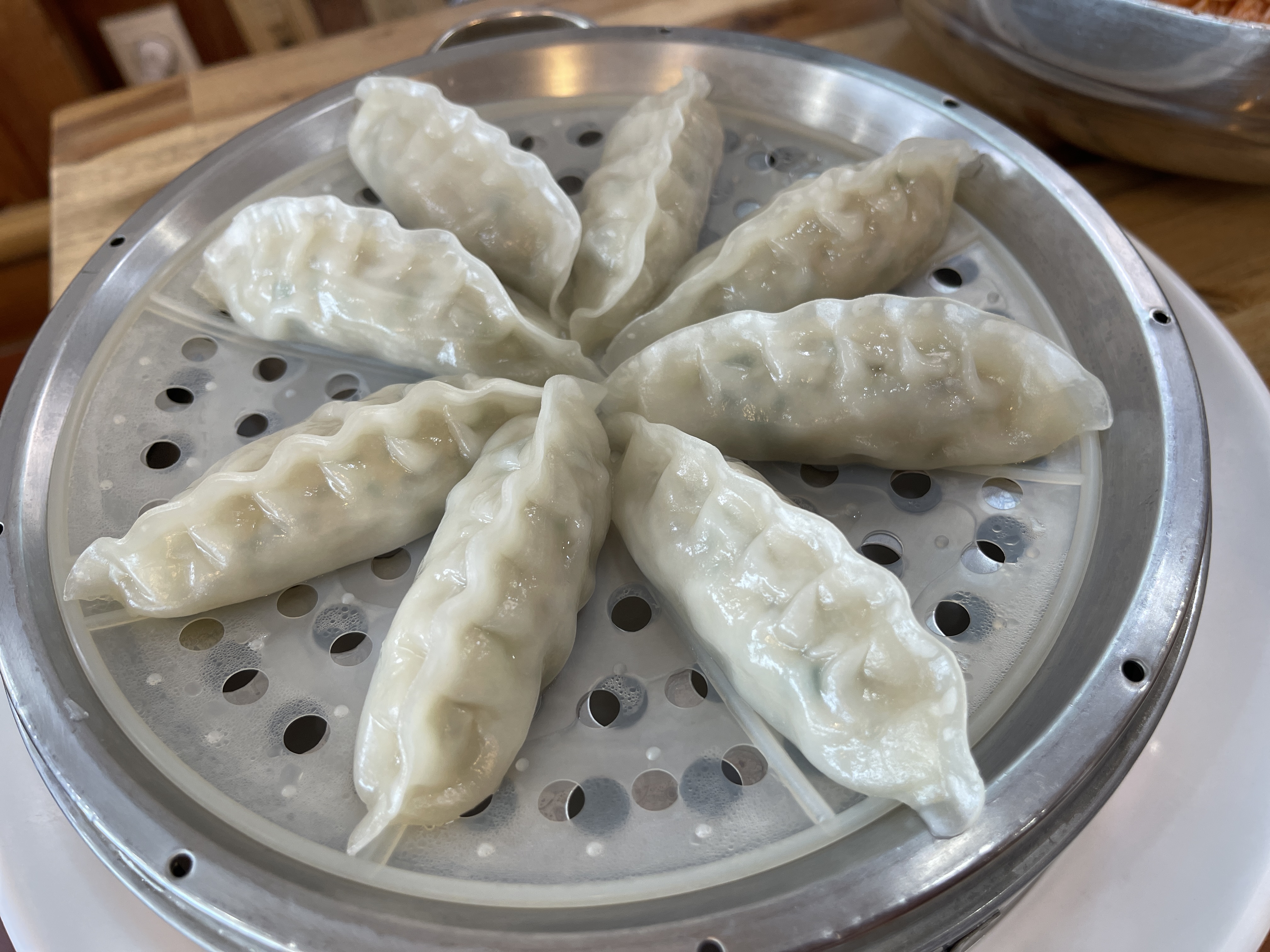 겉은 쫀득하고 속은 푸짐한 만두. 만두피의 쫀득함이 식감을 더 좋게 만드는 것 같다.