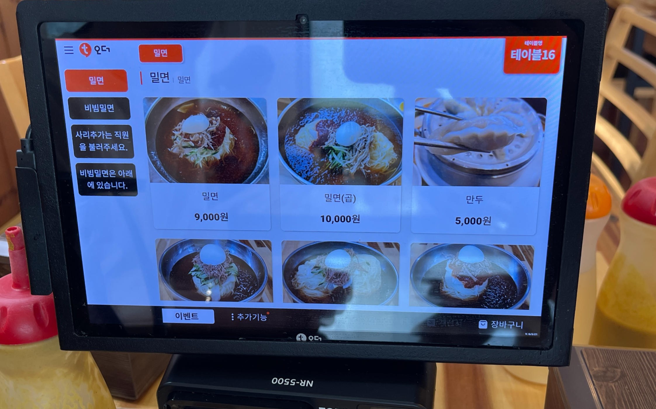 오랜만에 왔더니 해운대가야밀면에도 테이블마다 태블릿주문기기가 설치되어 있다. 간편하게 주문할 수 있으니 좋다. 해운대 가야밀면에선 비빔밀면에 사리추가(3,000원)해서 먹곤 했는데, 오늘은 굳이 그러지 않았다. 물밀면, 비빔밀면, 만두 전부 다 먹고 싶어서 보통사이즈로 3총사 모두 주문!