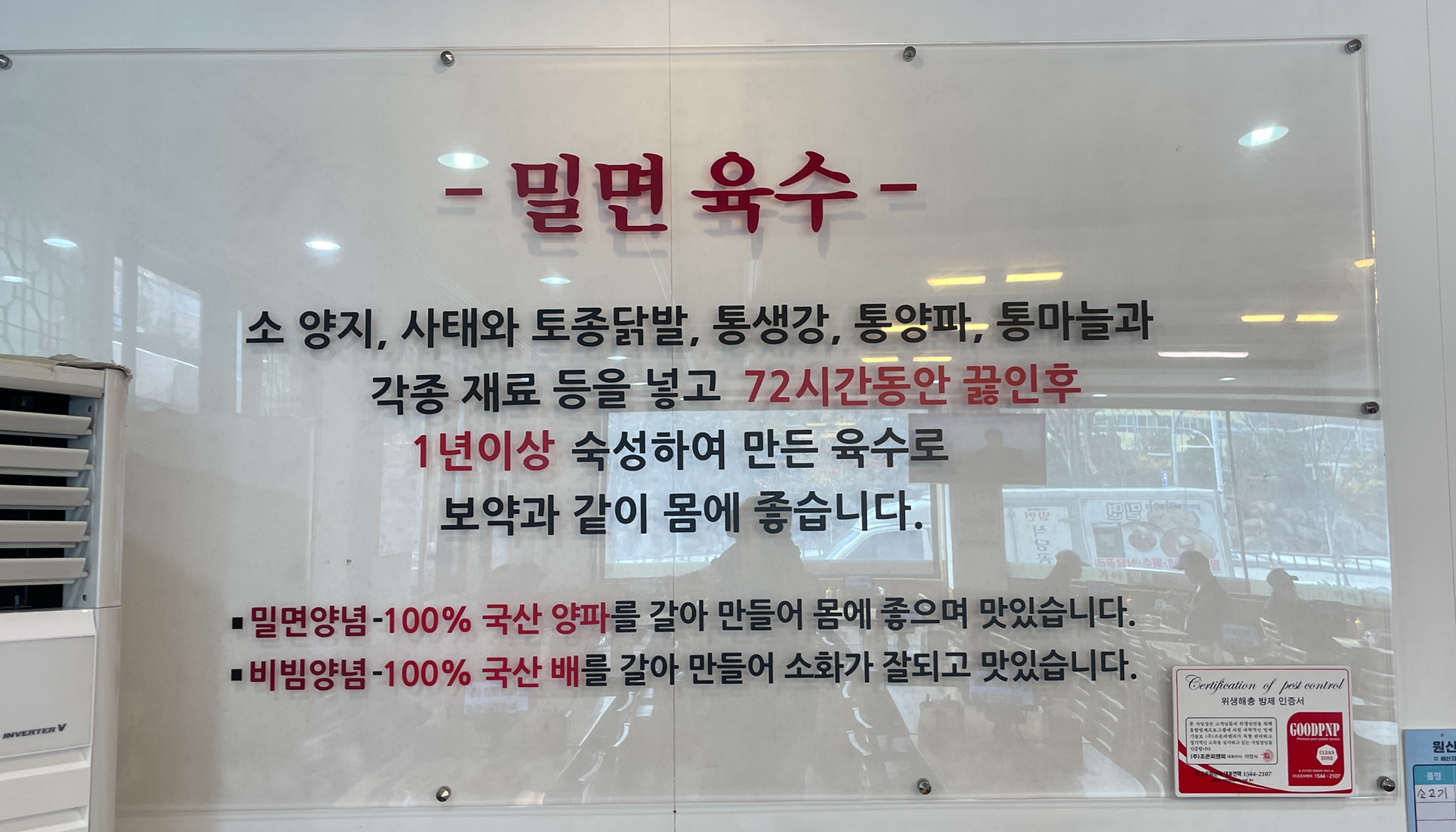 소양지, 사태와 토종닭발, 통생강, 통양파, 통마늘과 각종재료 등을 넣고 72시간 동안 끓인 후 1년 이상 숙성하여 만든 육수로 보약과 같이 몸에 좋습니다. 밀면양념은 100% 국산양파, 비빔양념은 100% 국산배를 갈아넣어 소화가 잘된다는 구구절절한 설명이다.