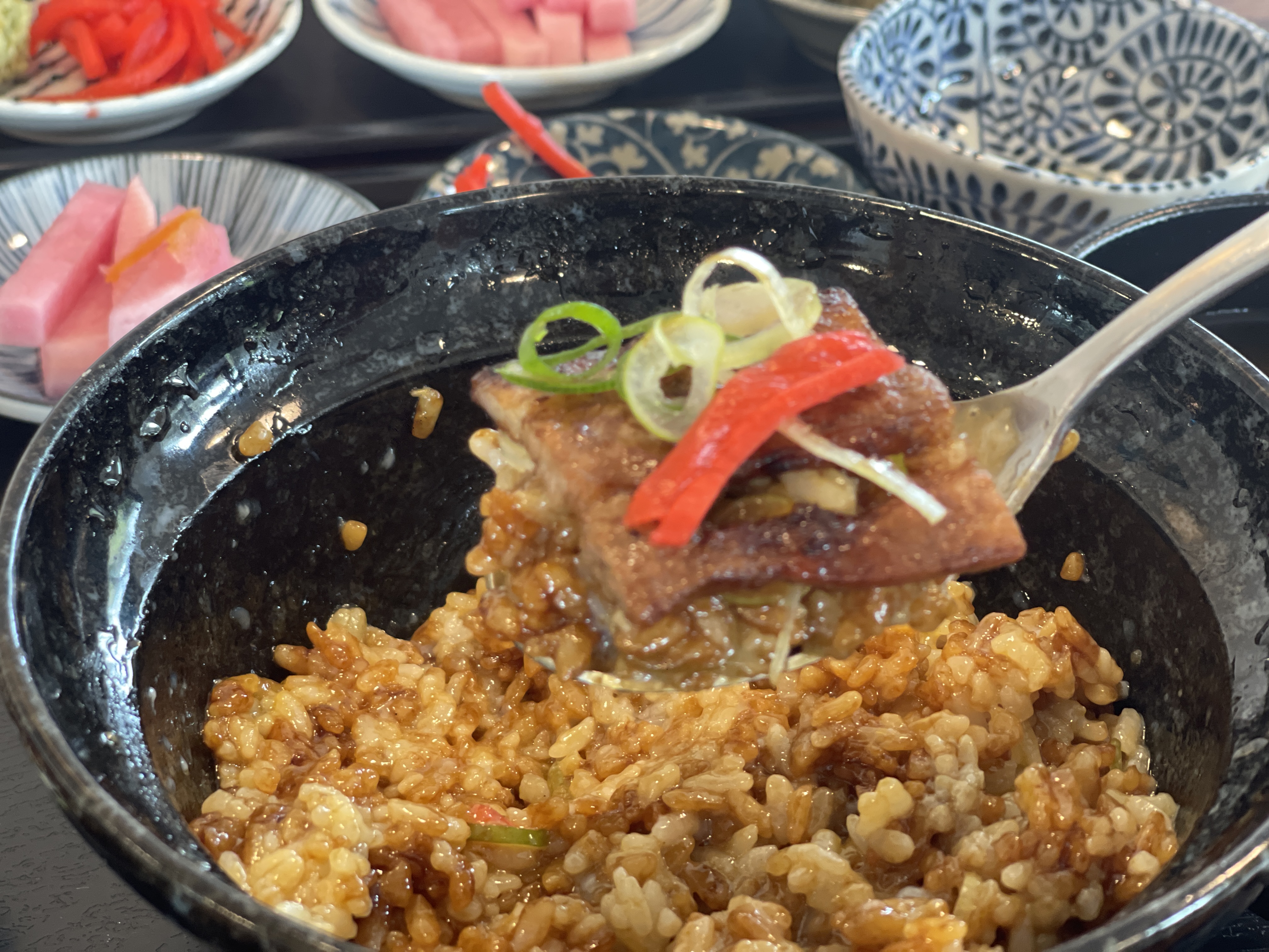먼저 화리만의 먹는방법으로 먹어본다. 덮밥위에 고기한점 그리고 파송송과 초생강, 생고추냉이를 올려서 와구와구~ 따끈할 때를 지나 식어가는 중임에도 맛있다. 고기비린내 없이 양념맛이 일품이다.