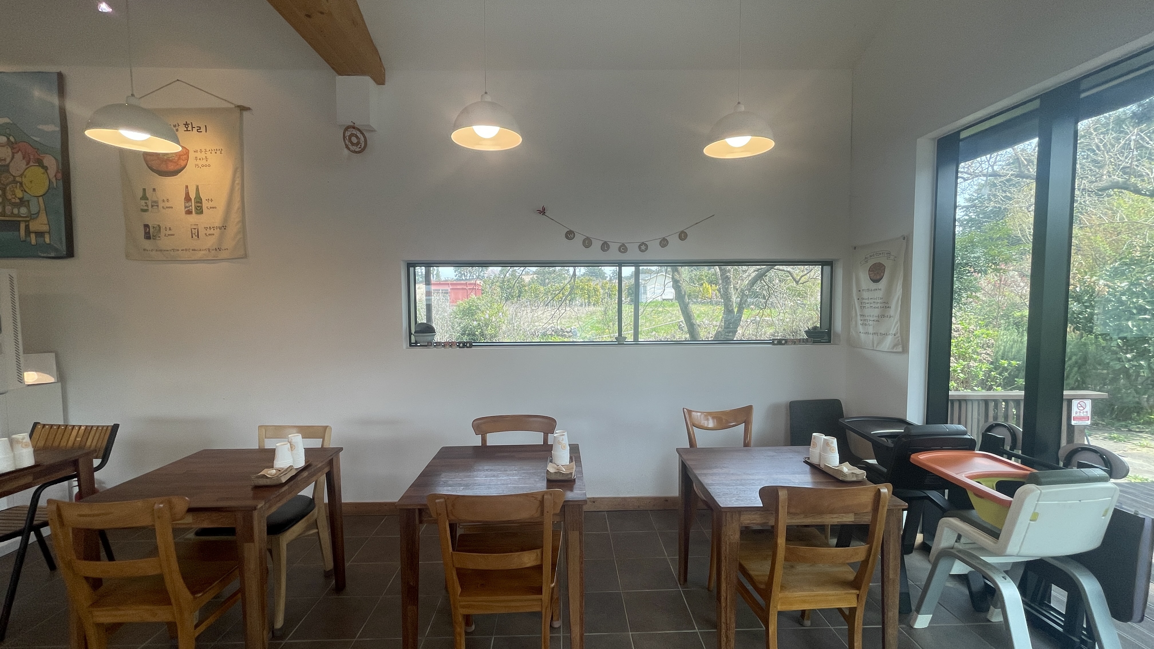 밝은 햇살이 내부를 환하게 해주고, 원목으로 만들어진 테이블과 조그만 소품들이 가게의 운치를 더해준다. 페브릭을 활용한 메뉴와 먹는방법에 대한 설명 그리고 화장실칸막이까지 나름 신경쓴 모습이 보인다.