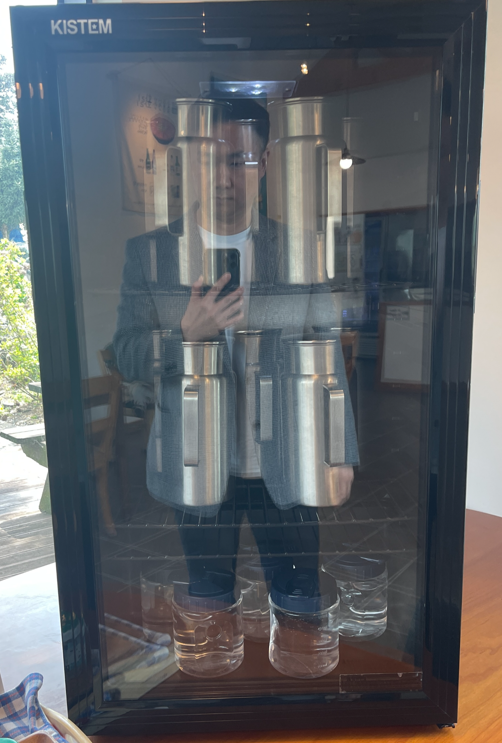 한켠에 마련된 물 전용냉장고가 아담하다. 물병도 깔끔!