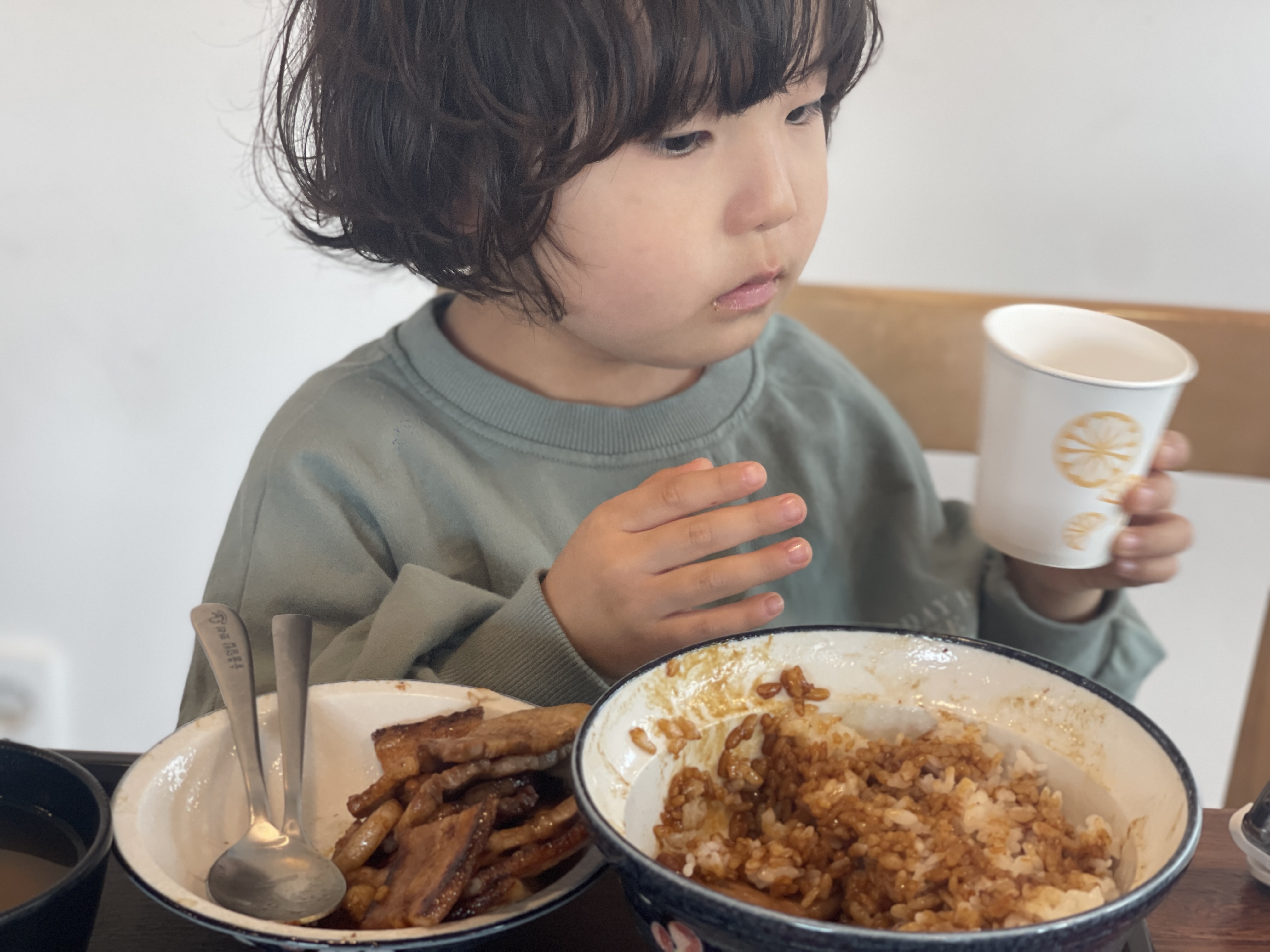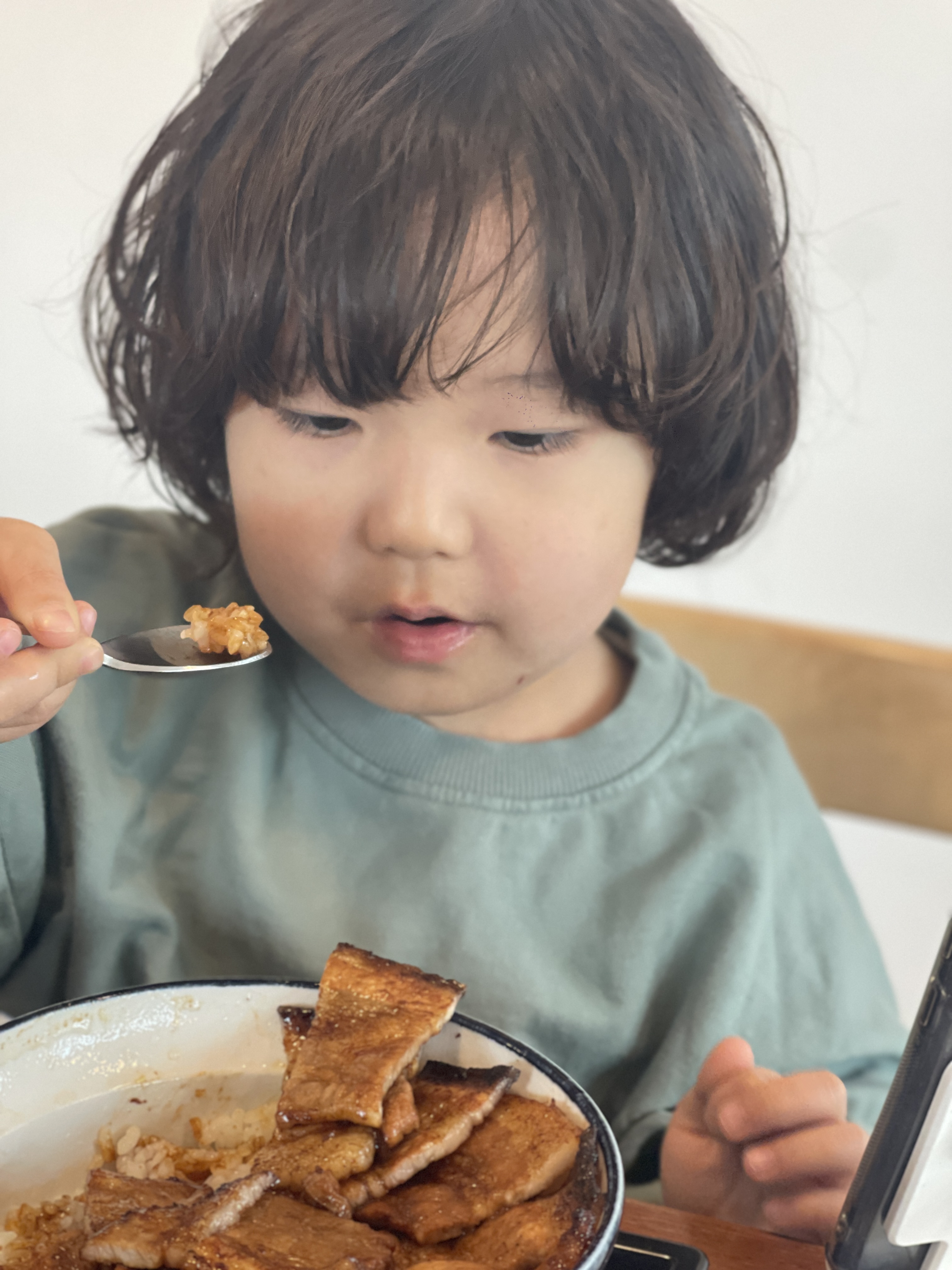 오늘 라온이와 함께 방문한 것이 신의 한수! 대식가에겐 작은 양이지만, 고기와 밥의 양이 아이에겐 상당한 양이다. 고기와 덮밥을 허겁지겁 먹던 녀석은 금새 배가 불러왔는지 아빠가 먹어도 된다고 윤허해준다. 아싸! 이로써 라온이와 아빠 모두가 만족할 수 있게 되었다.