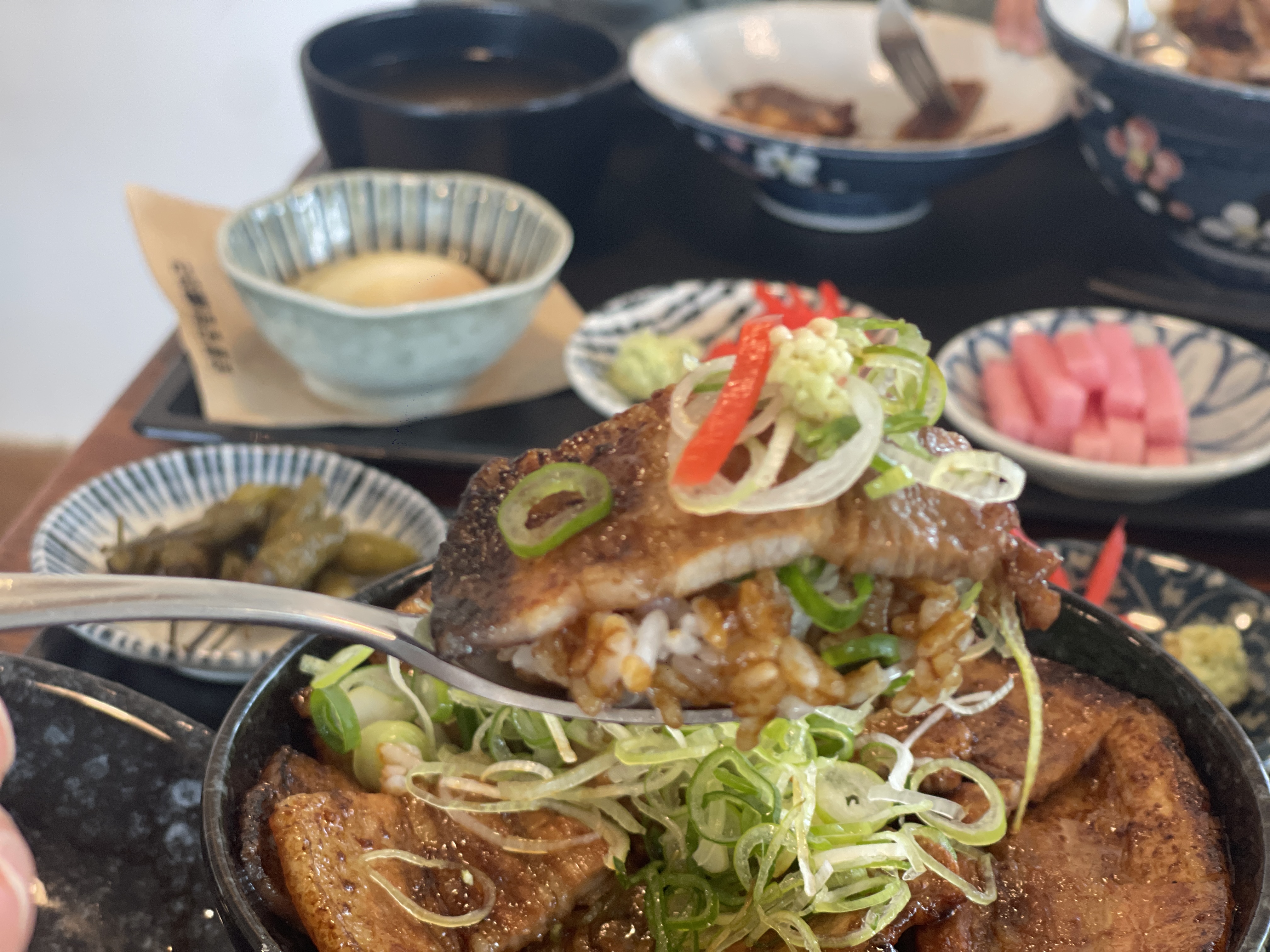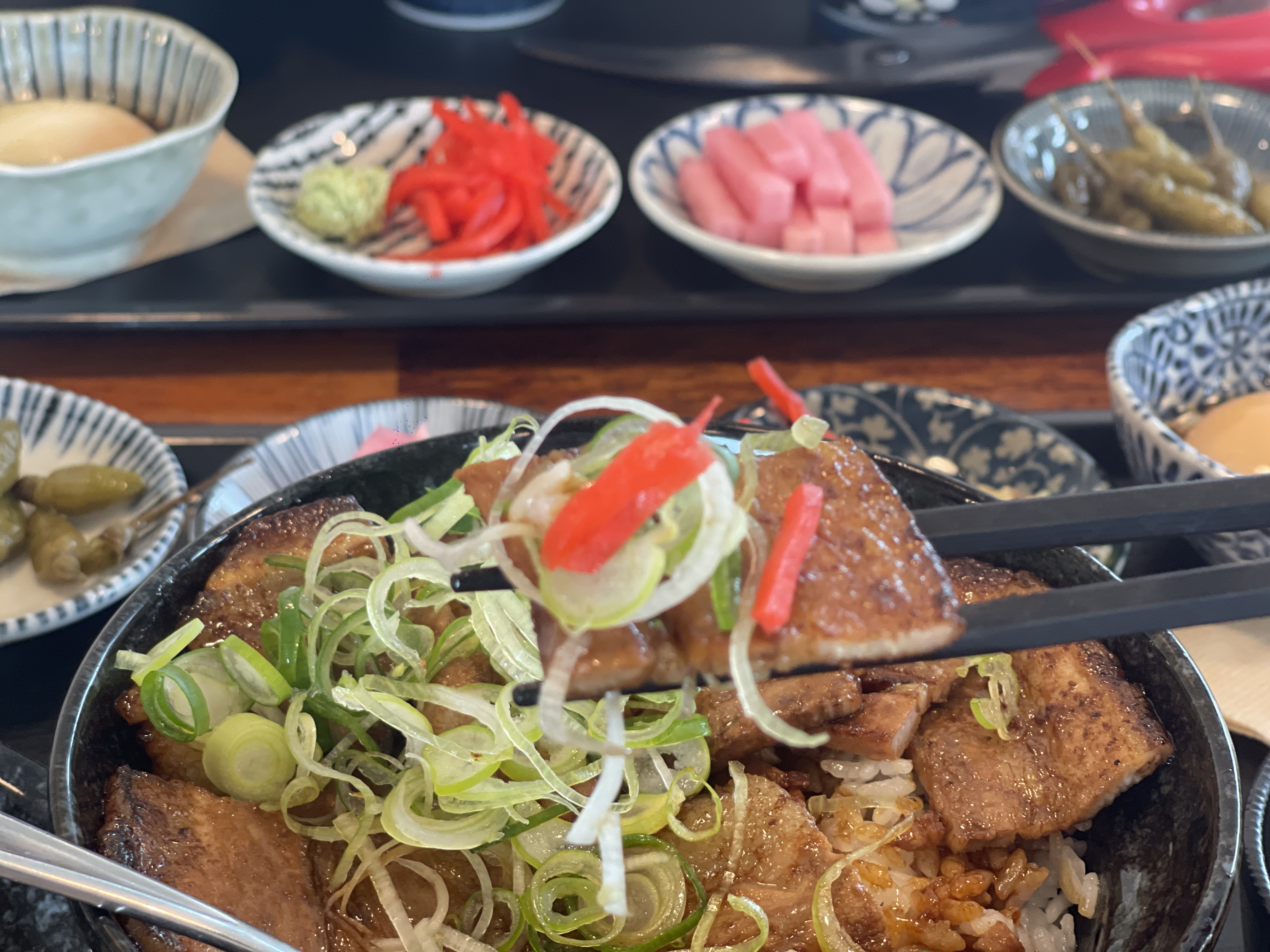 고맙게도 아이가 먹을 부타동엔 파고명을 빼주셨다. 아마 파가 듬뿍 올려져 있었으면 입을 대기도 전에 먹지 않았을 것이다. 파가 없음에도 너무 맛있어 보이는 부타동 비쥬얼. 슬쩍 봐도 양념이 제대로 베어 구워진 고기다.