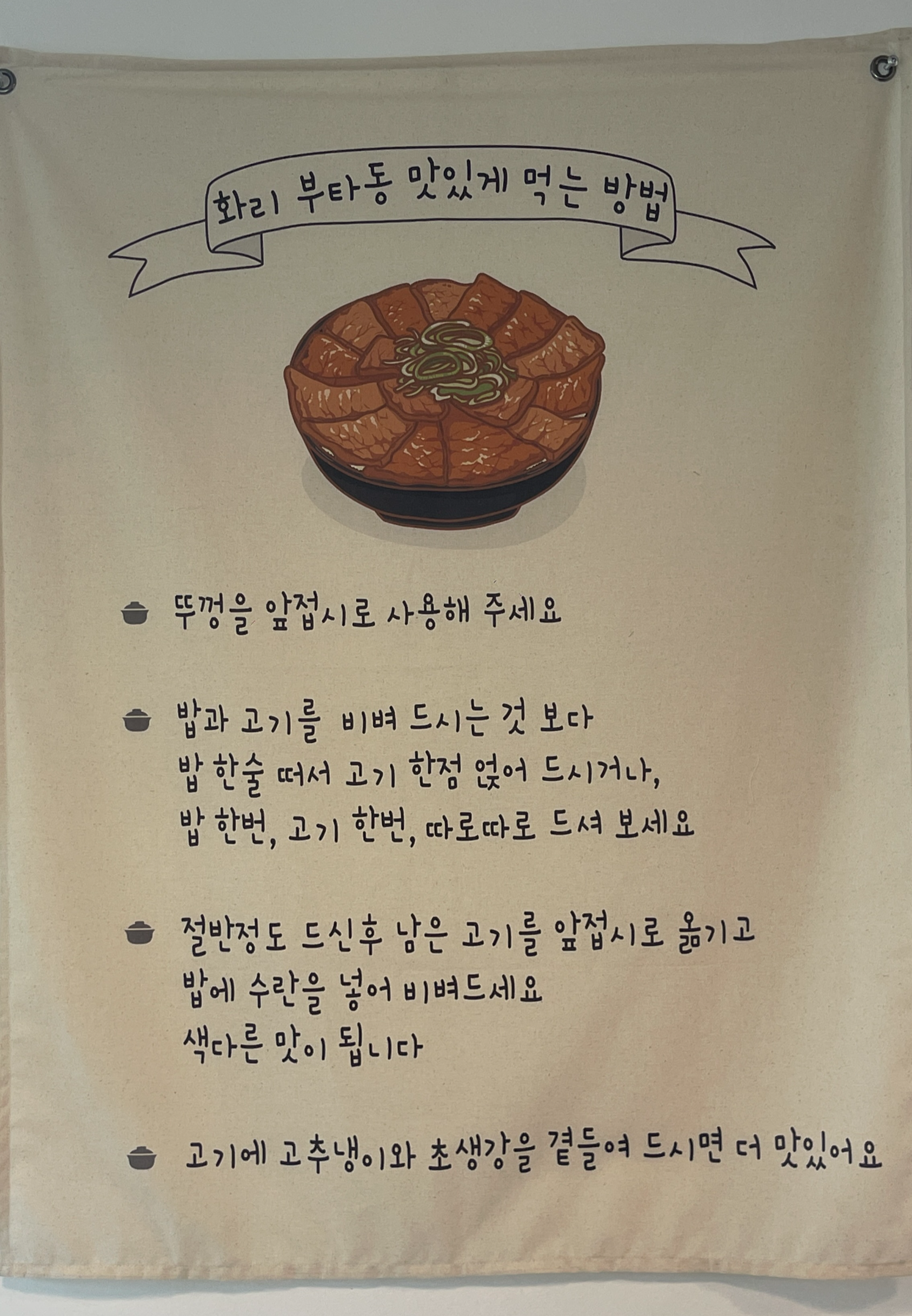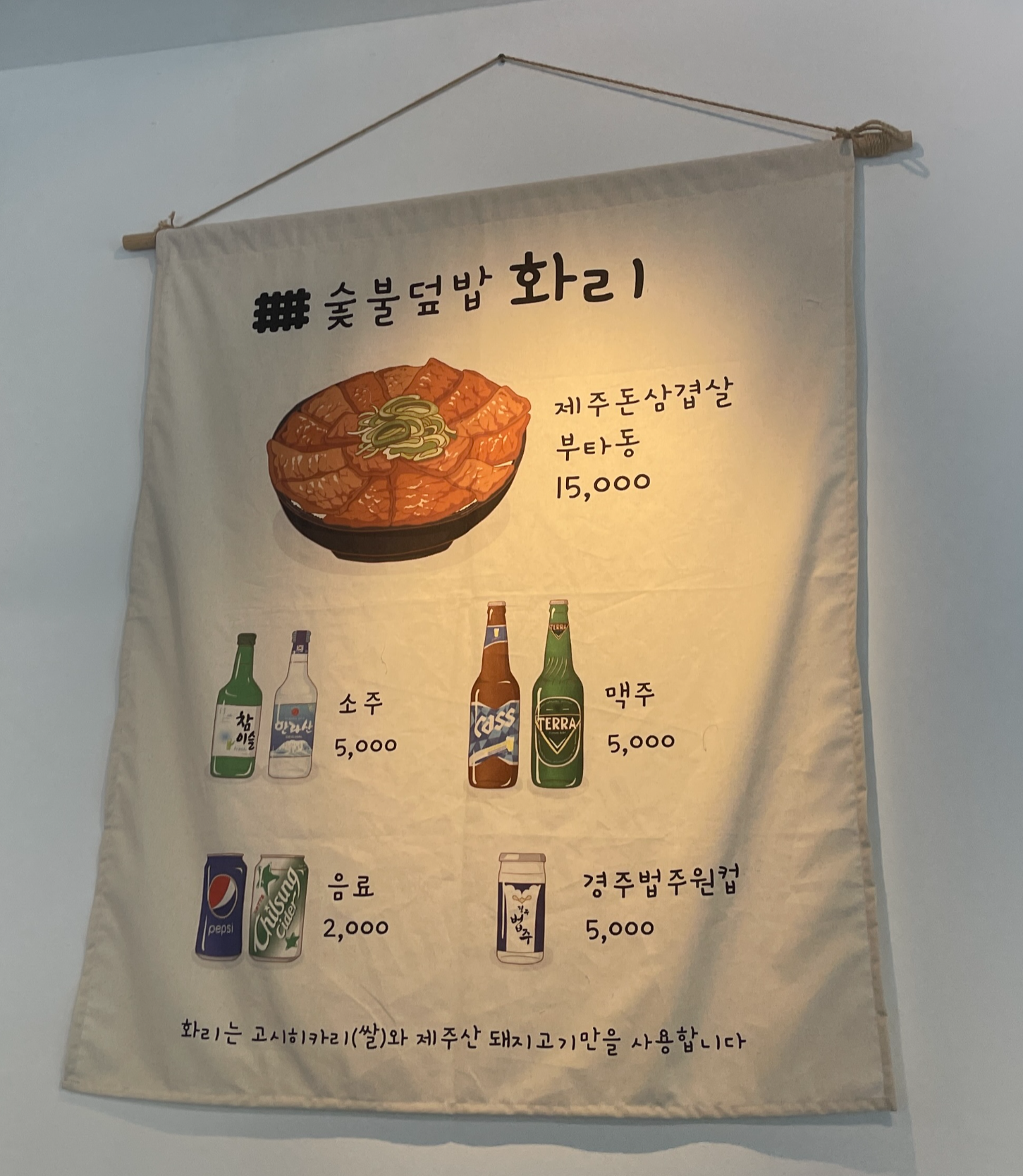 결정장애, 선택장애가 무용지물인 유수암맛집 숯불덮밥화리! 딱 한가지 메뉴밖에 없다. 제주돈삼겹부타동. 원래 덴마크산 고기를 이용한 화리덮밥도 있었지만, 지금은 제주돈삼겹부타동만 판매중이라고 한다. 우리는 오늘 첫번째 손님이다.