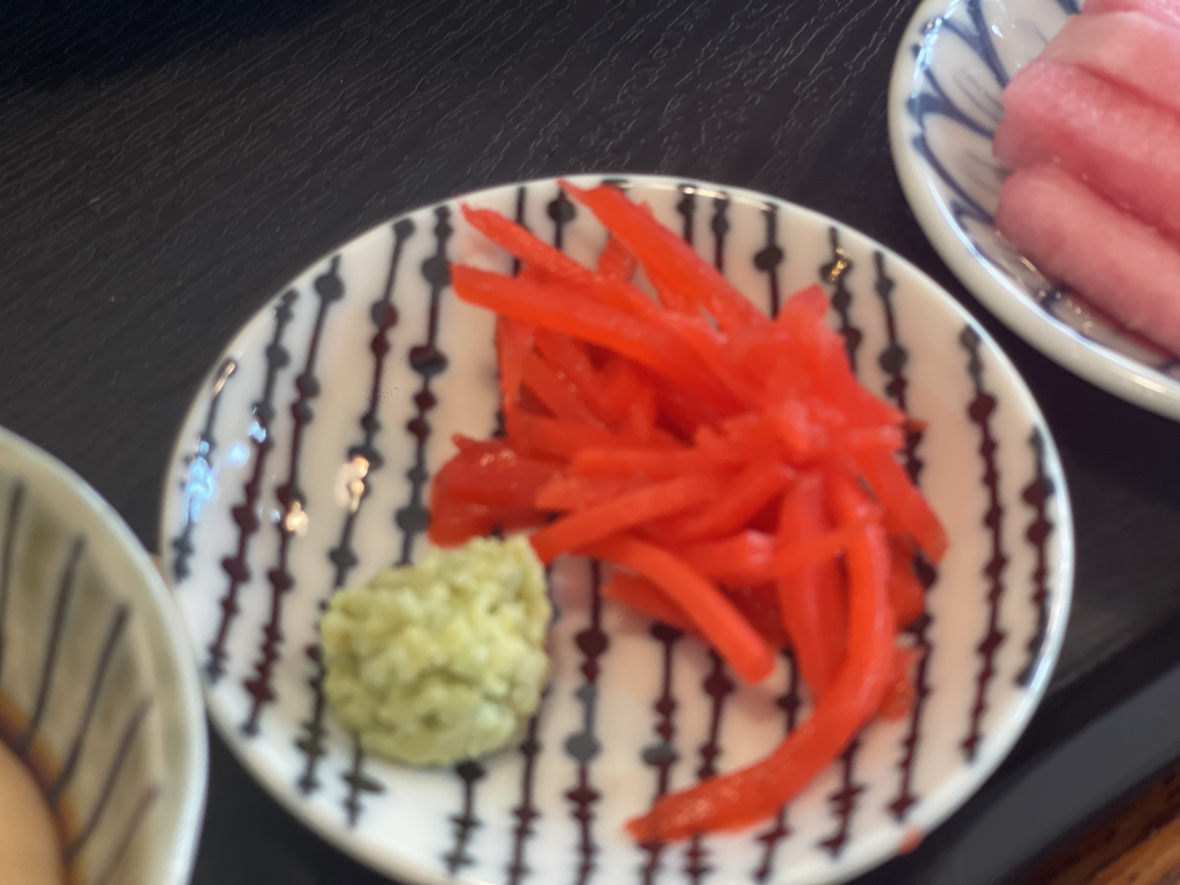 나중에 비벼먹을 수 있는 수란이 양념소스와 같이 놓여지고, 초생강과 생고추냉이, 무피클 그리고 산고추가 반찬으로 나온다.