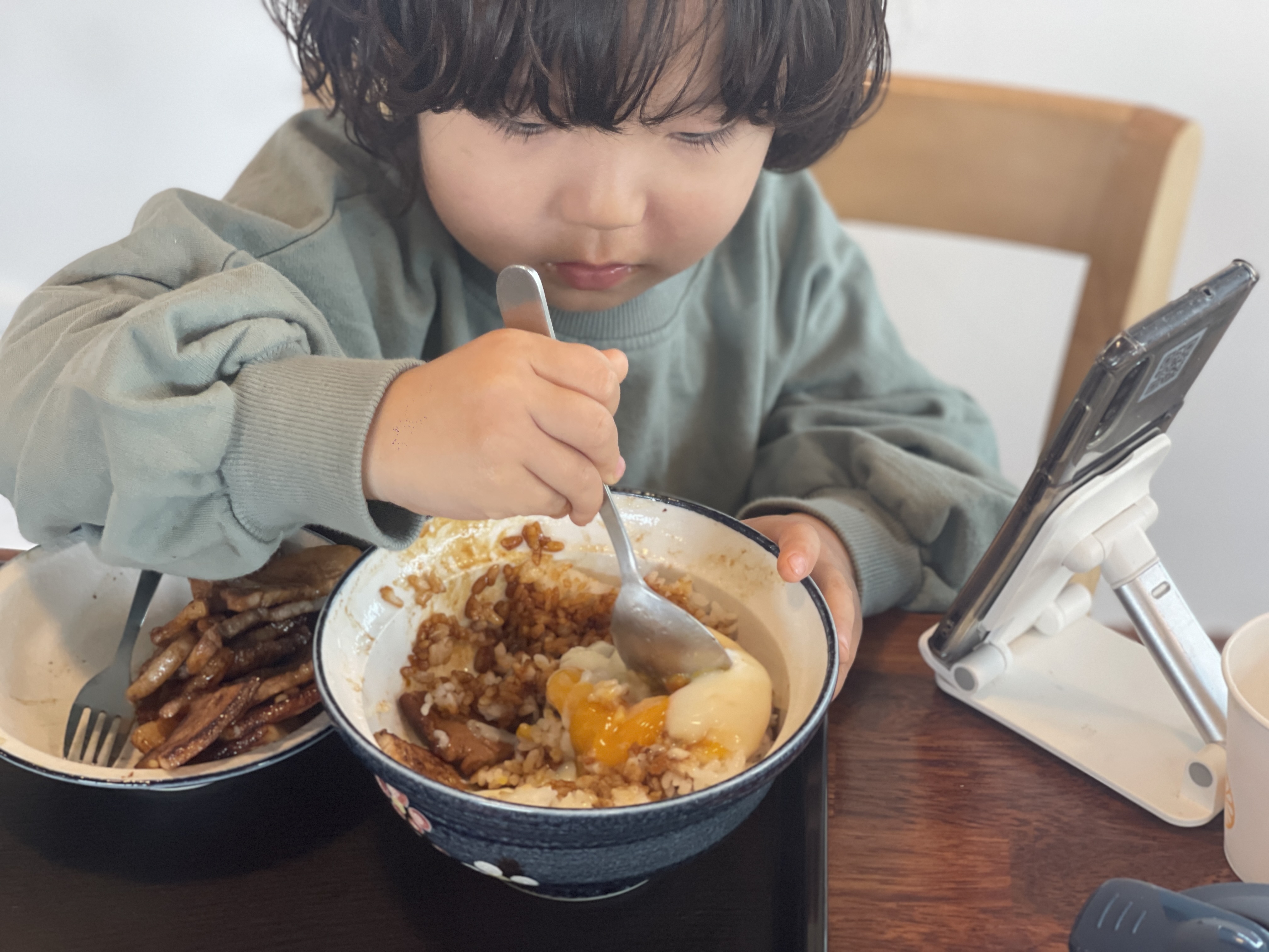덮밥을 너무 맛있게 먹고 있어서, 수란을 넣어먹으면 또다른 별미가 된다던 팁을 따라해보기 위해 수란을 톡 터트려 넣어주었다. 직접 비벼주려고 하니, 스스로 해보겠다며 슥삭슥삭 비비는 라온이. 달걀의 풍미가 더해진 부타동의 맛은? 역시나 엄지척이다! 다행이다. 혹시나 입맛에 맞지 않으면 어쩌나 노심초사하면서 왔던 곳인데, 고기부터 덮밥 그리고 수란까지.. 제대로 잘 먹어줘서.. 애월맛집이고 유수암맛집이고 아이와가볼만한 맛집이다. 근처에 아이와가볼만한 제주공룡랜드, 981파크, 새별오름, 제주안전체험관 등의 여행지와 연계하여 방문해도 정말 좋을 것 같다.