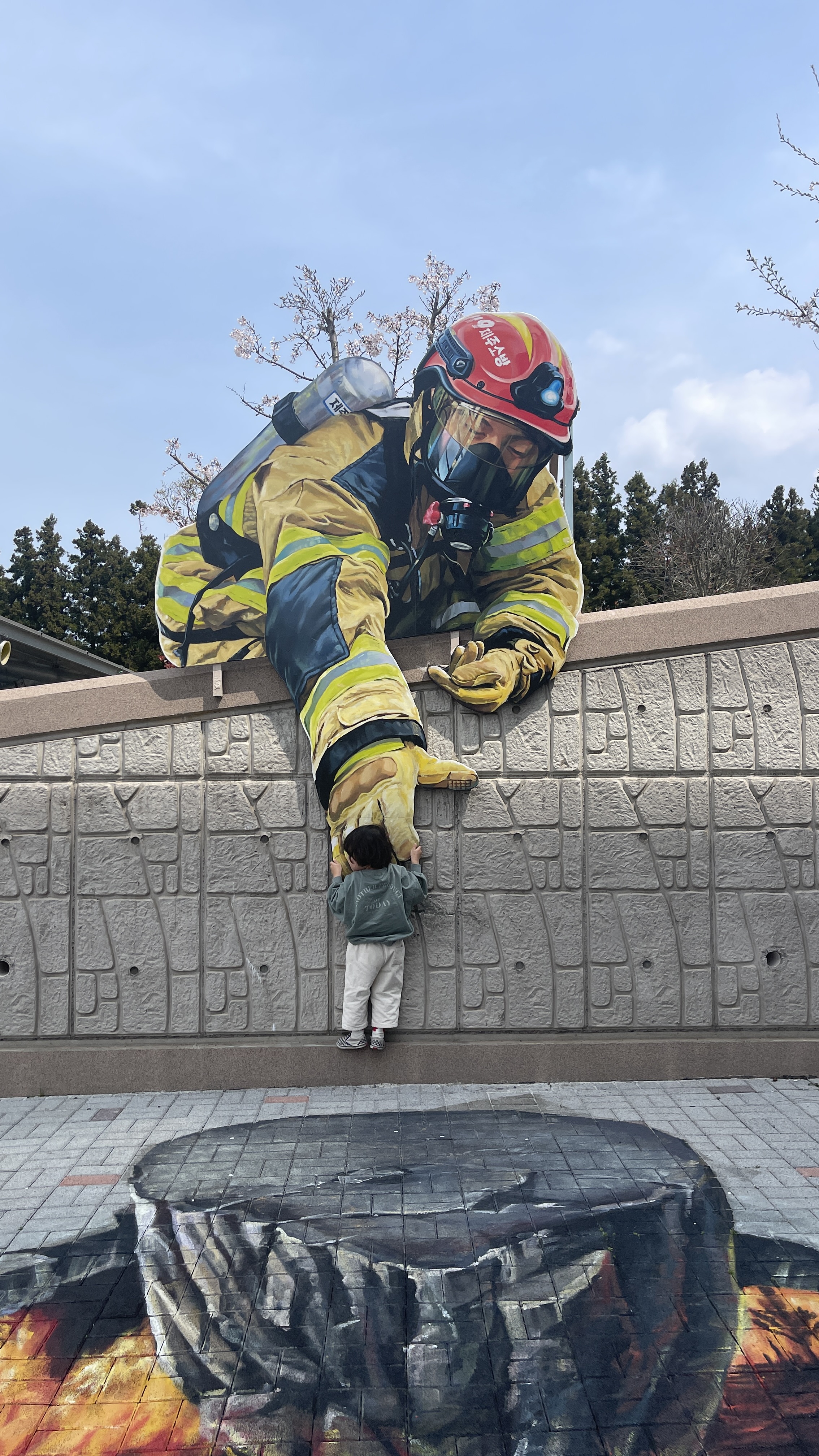 매번 집 거실에서 볼케이노 놀이하며 좋아라 했는데, 제주안전체험관 앞에는 트릭아트로 화염이 치솟는 볼케이노가 있다. 얼른 소방관아저씨의 손을 잡으며 매달려보는 라온이.