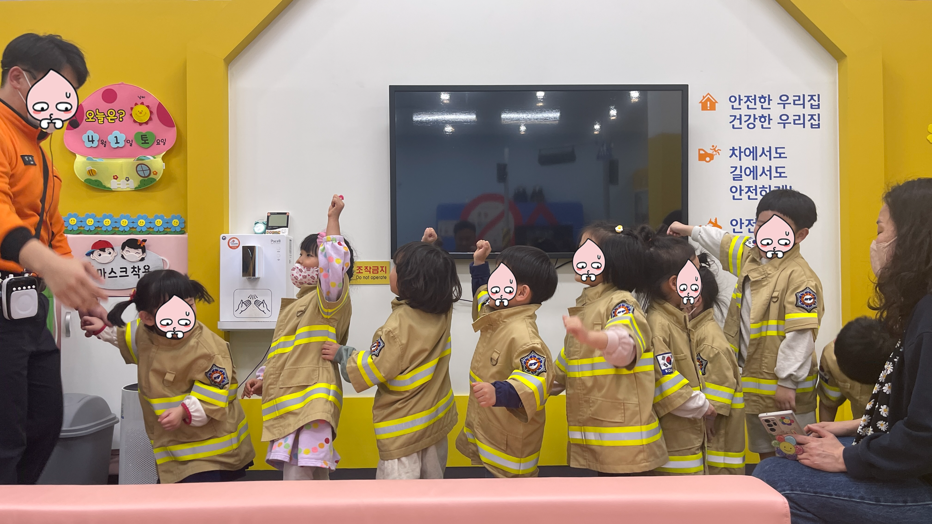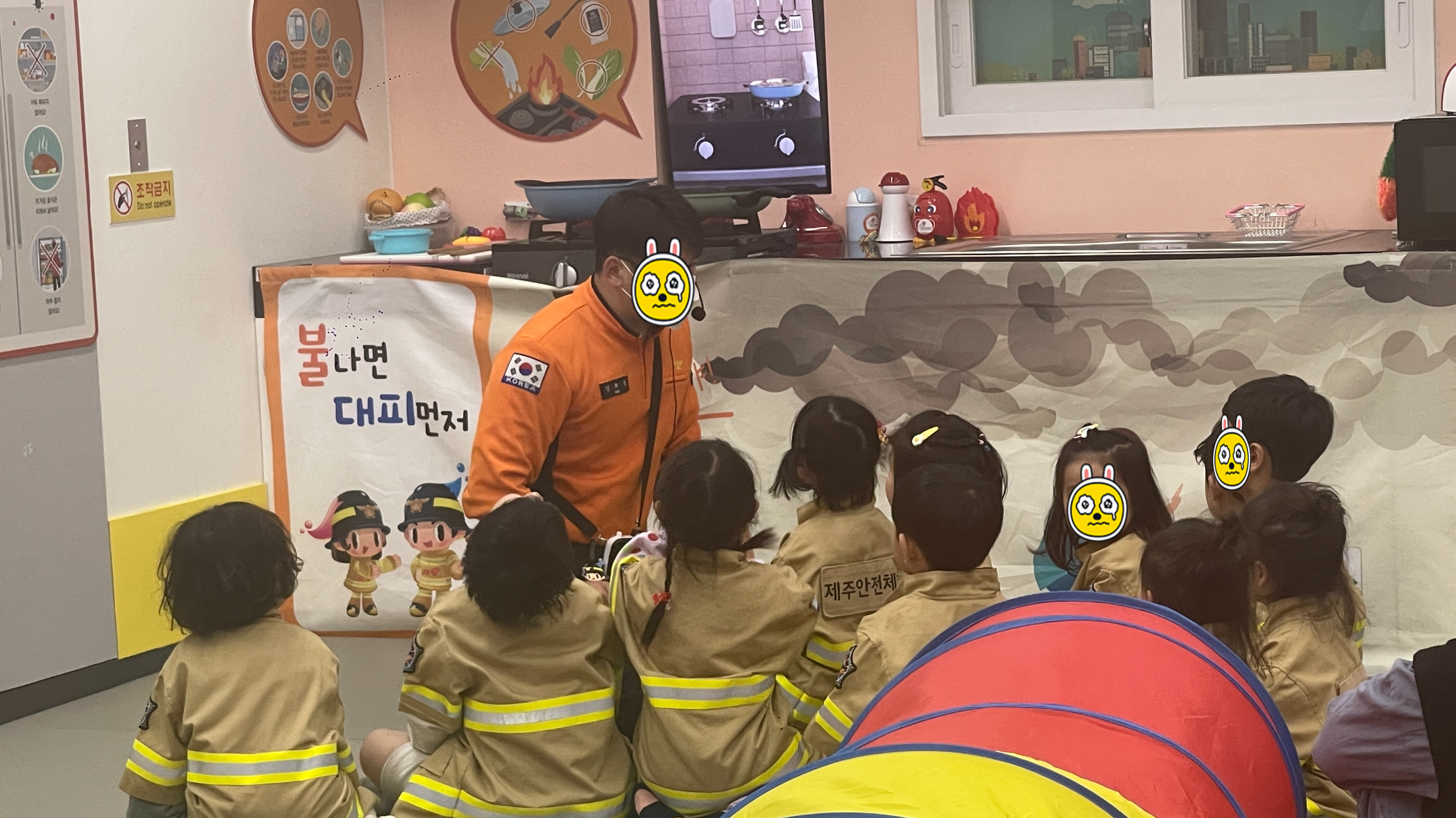 교육이 진행되는 동안 부모님은 대기실에서 기다려야 하기 때문에 사전에 아이들과 포토타임을 갖는 시간을 할애해 준다. 어린이안전체험이라서 별거 없는게 아닐까란 생각을 했는데, 안전체험뿐만 아니라 위생교육 해상안전, 항공기안전 등 아주 다양 상황을 구현해 놓고 있어 알찬 시간을 보낼 수 있을 것 같다. 소방관옷을 입은 아이들은 여기저기 뛰어다니며 어린이집에서 보고 배웠던 것들을 자랑하느라 바쁘고 놀기 바쁘고, 엄마들은 그런 아이들의 모습을 사진으로 남겨두기 바쁘다... 그러고보니.. 나만 아빠구나...