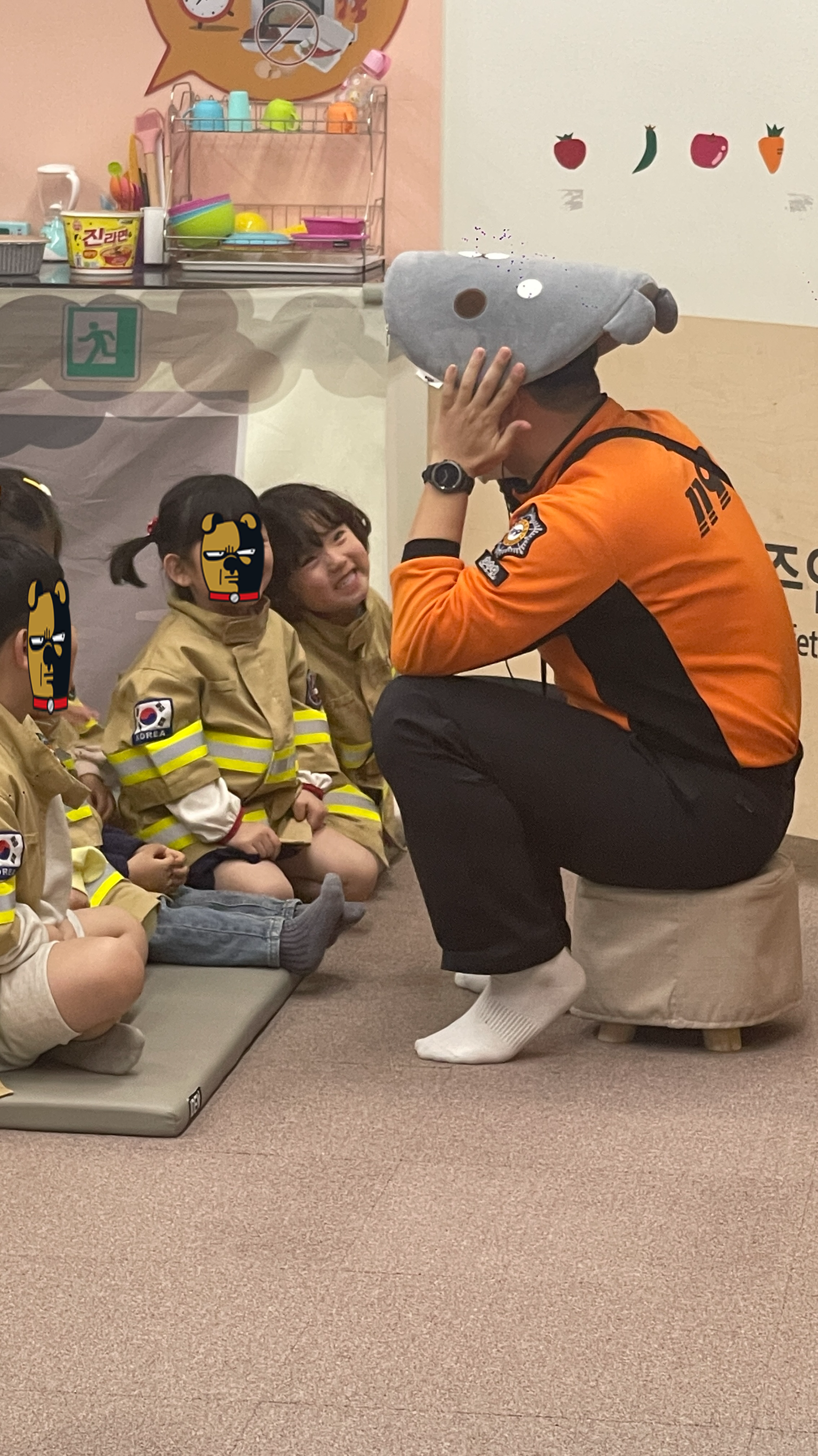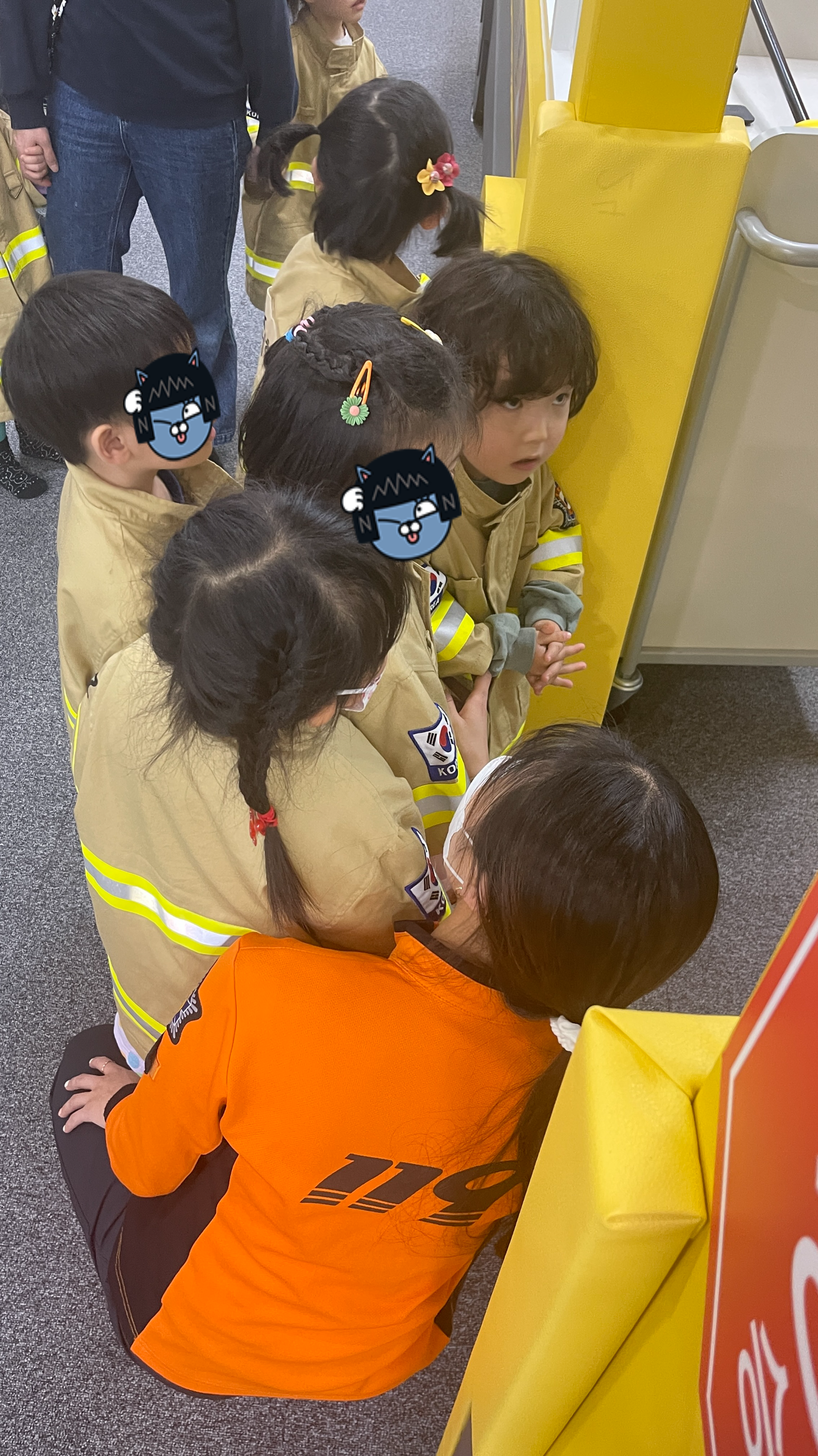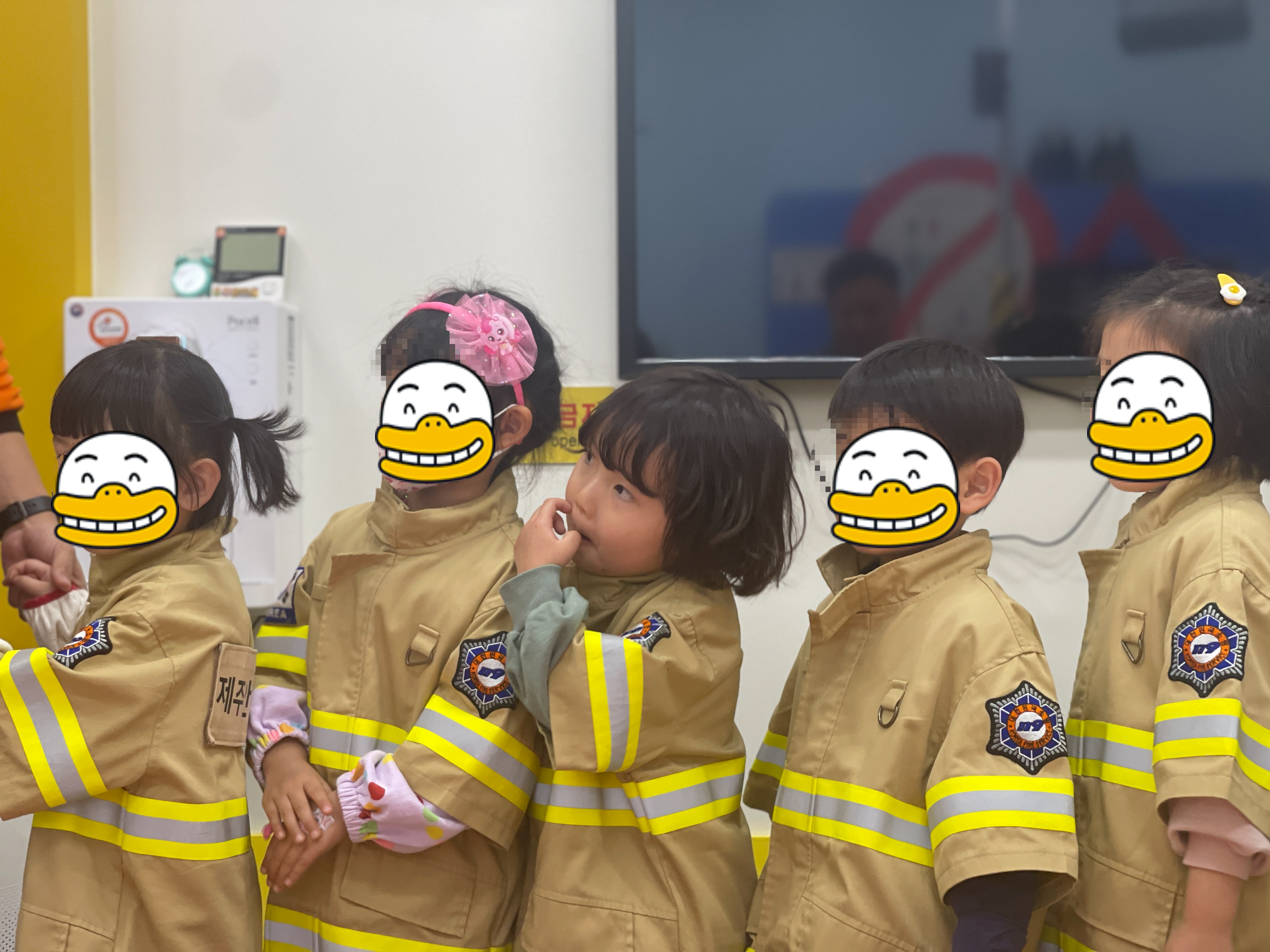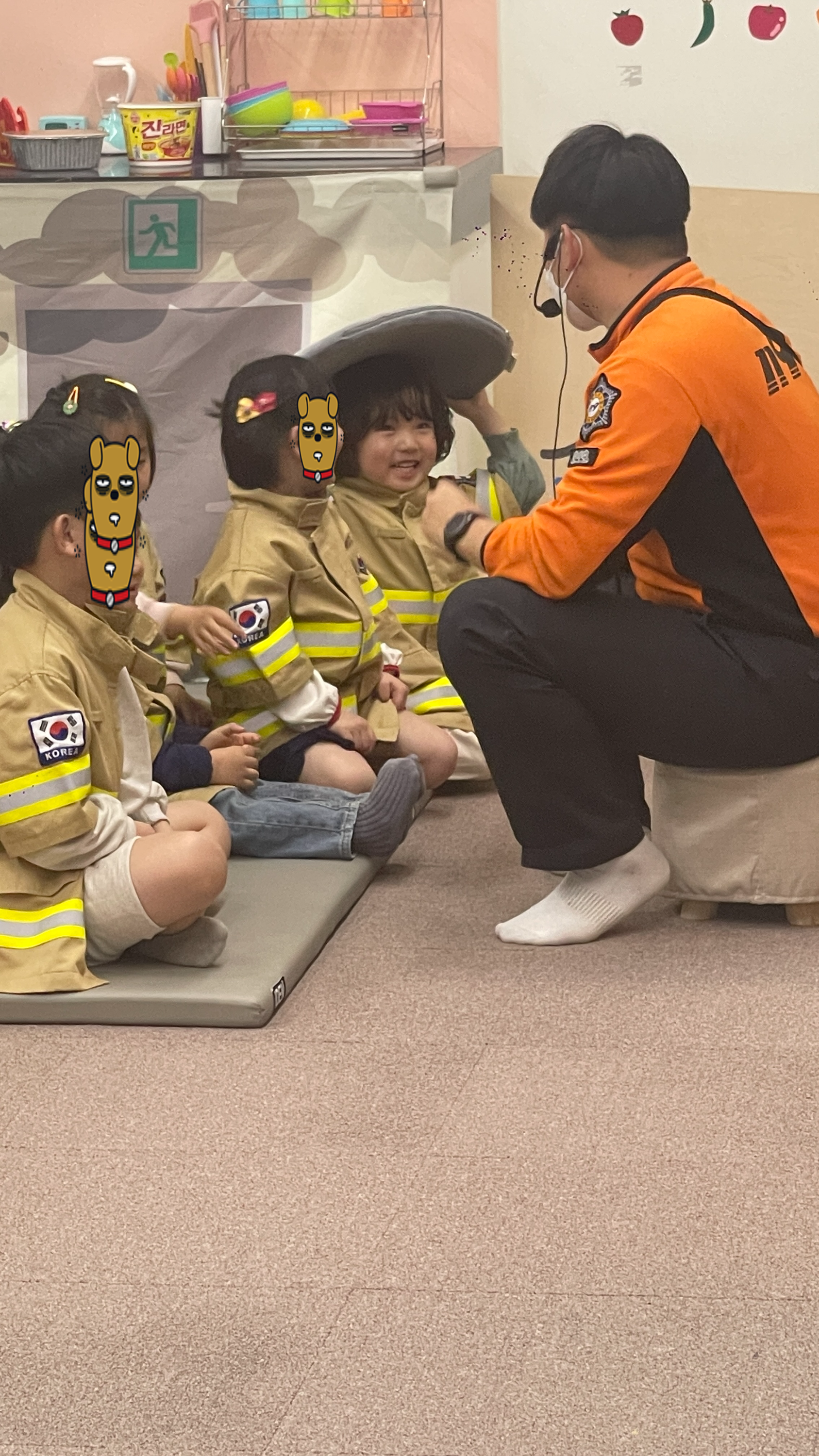 교육시간이 되어 어린이안전체험관으로 입장하라고 하는데, 아이들 모두에게 소방관복장을 착용해준다. 너무 귀엽다 ^^ 이렇게 복장까지 갖춘다면 역할놀이를 겸한 체험학습은 더욱 재미있을 것 같다.