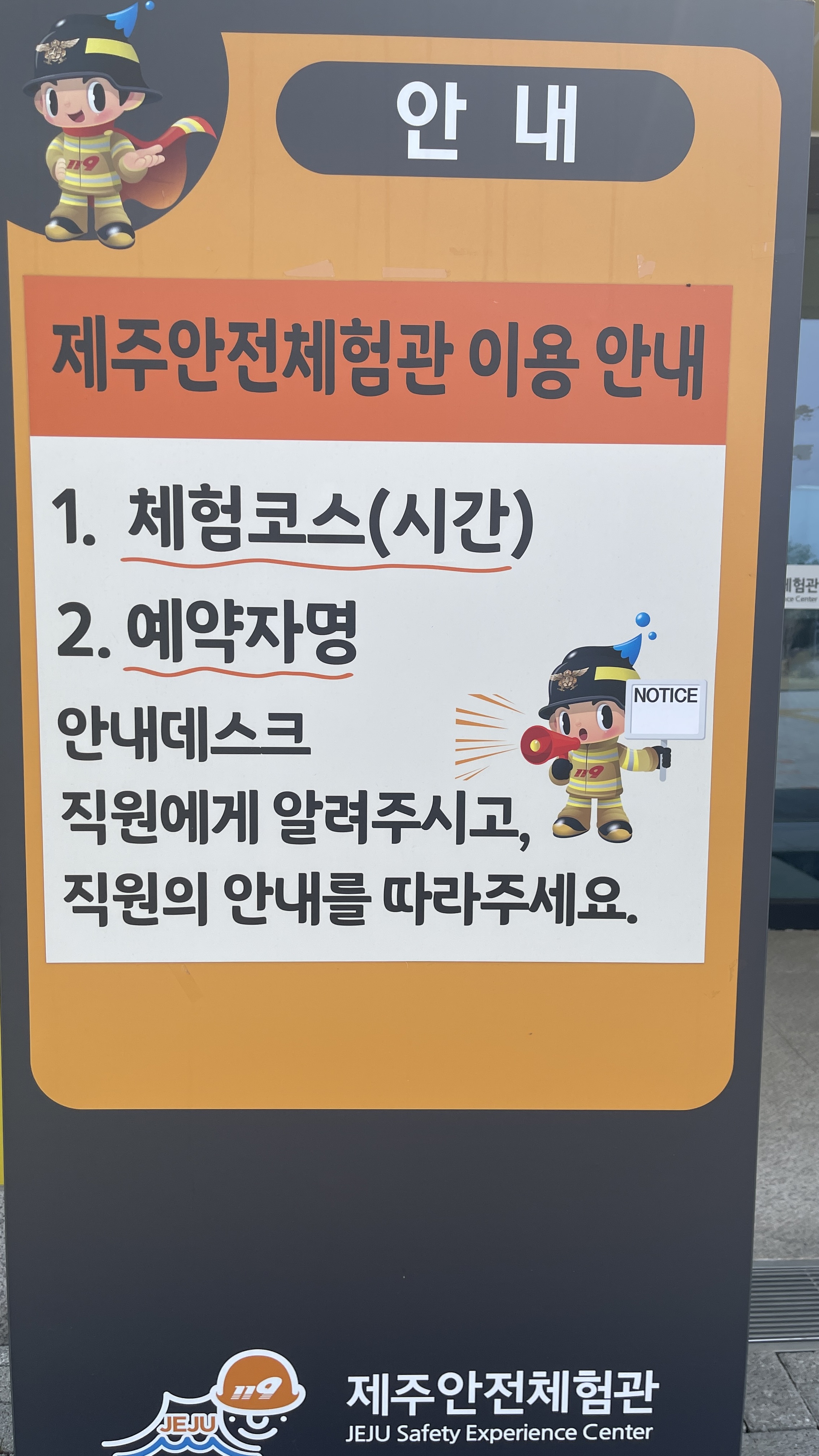 사전예약을 했다면, 내부로 입장하여 체험코스와 예약자명을 알려주면 교육시간과 장소를 안내받을 수 있다. 5살부터 7살까지는 어린이안전체험과 4D 상영관체험만 가능하며, 초등학생이상이라야 더 많은 체험을 할 수 있다. 오늘은 어린이안전체험하는 것으로 만족하고 몇년 뒤를 기약해야할 것 같다.