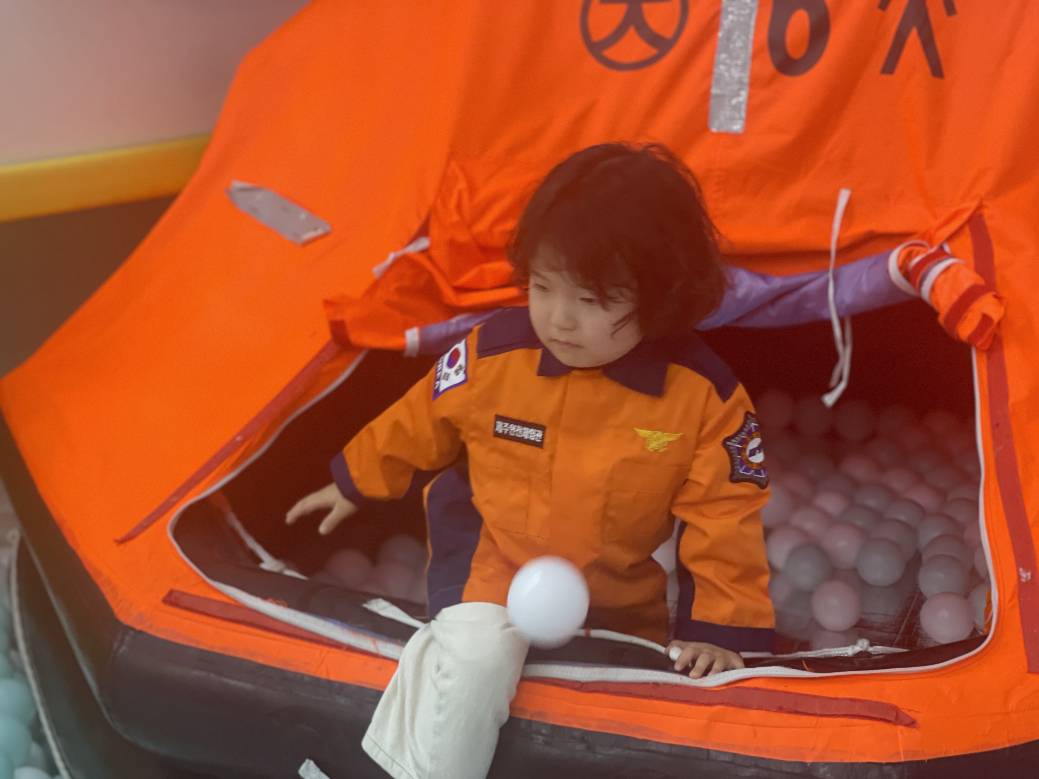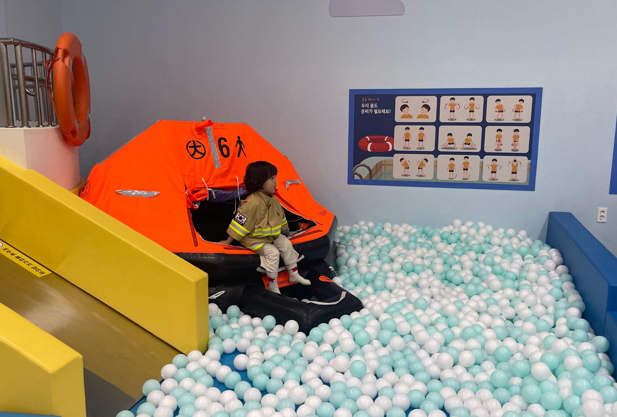 비행기를 여러번 타보기도 해서 승무원들이 보여주던 구명조끼의 설명은 아이나 부모 모두에게 익숙하다. 하지만, 이곳에선 실제로 구명조끼가 어떻게 부풀게 되는 지에 대한 설명을 직접 착용해서 해볼 수 있도록 해준다. 물론.. 착용까지만 되고 실제로 부풀지는 않게 되어있다. 선생님이 착용한 것만 부풀도록 되어 있는데, 실제로 부푸는 모습은 나도 처음이라 깜놀! 정말 순식간에 바람이 가득찬다. 마치 목튜브처럼 목 주변을 감싼 듯한 모습인데, 바다 위에서 몸을 둥둥 떠있게 만들어 주기엔 효과적일 것 같다. 그리고 바다 안전체험학습 때처럼 비상탈출하는 훈련도 겸해본다. 아까 바다체험 때 살짝 무서웠다고 겁을 먹긴 했지만, 다른아이들처럼 잘 해냈다. 기특해~