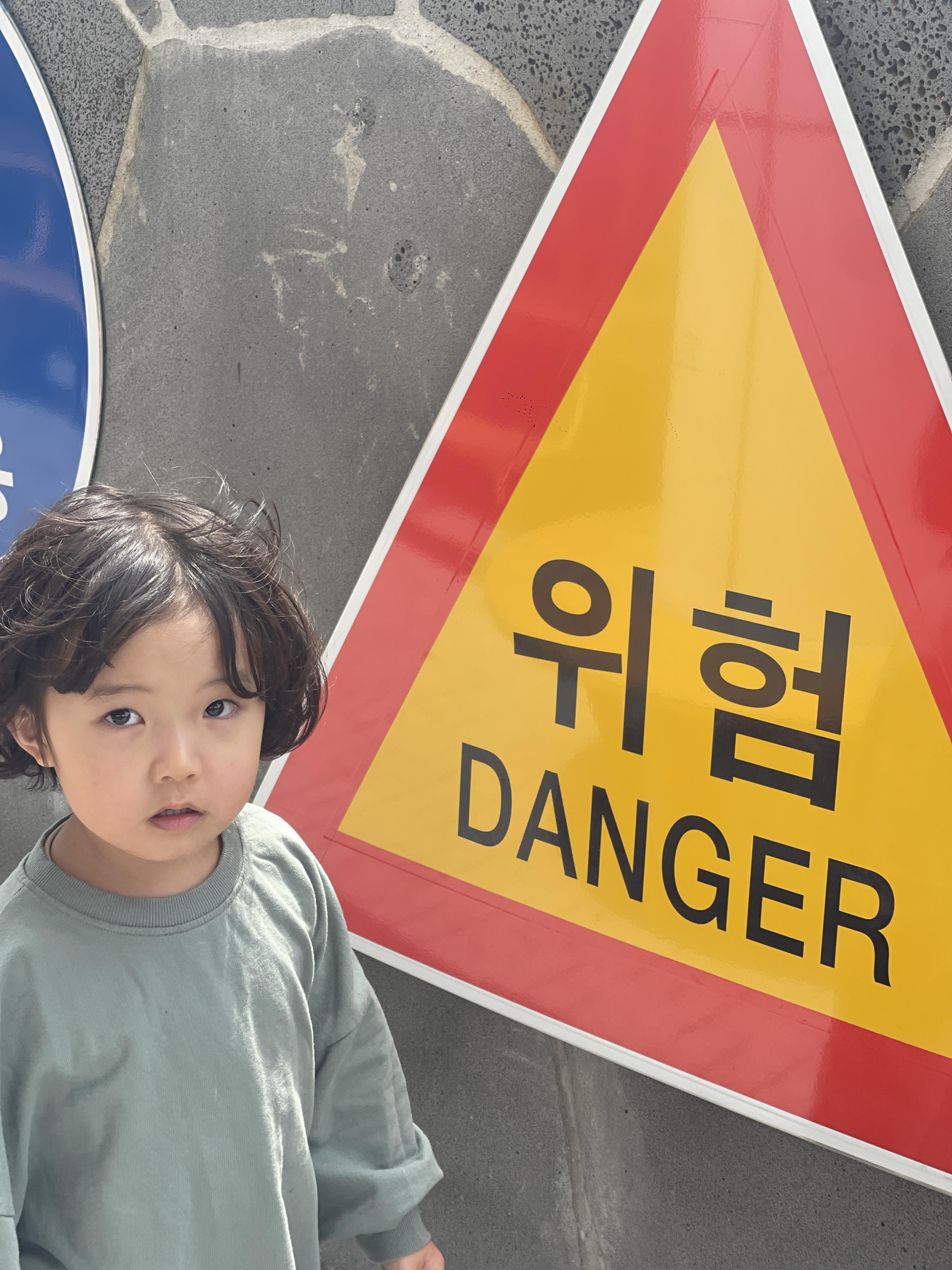 정원에서 뛰어놀까 싶어 나왔더니, 한켠에 교통안전표지판이 부착되어 있어서 한글놀이도 할겸 안전표지판이 무엇을 뜻하는 것인지 아빠와 함께 공부해보는 시간도 가졌다.