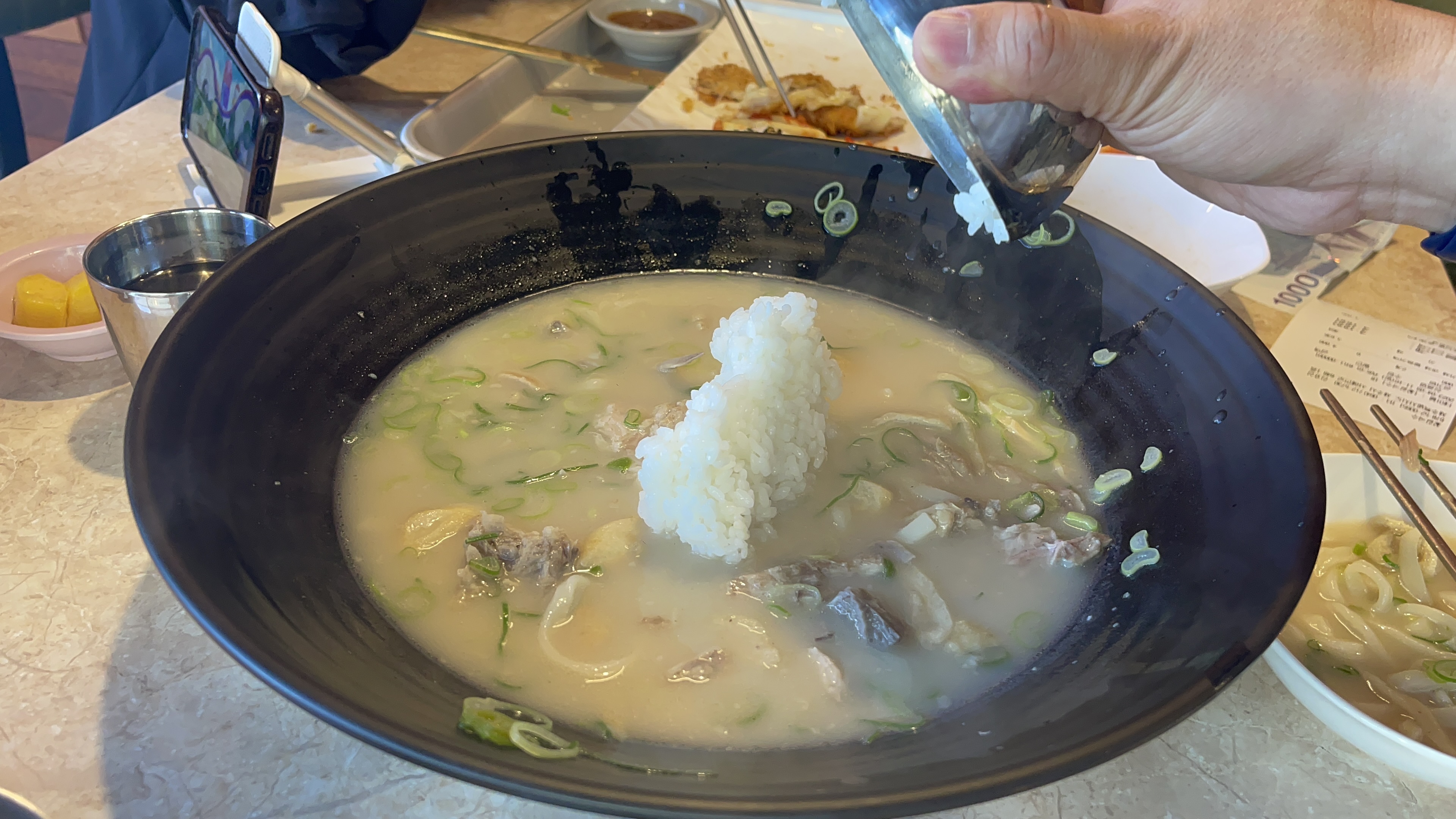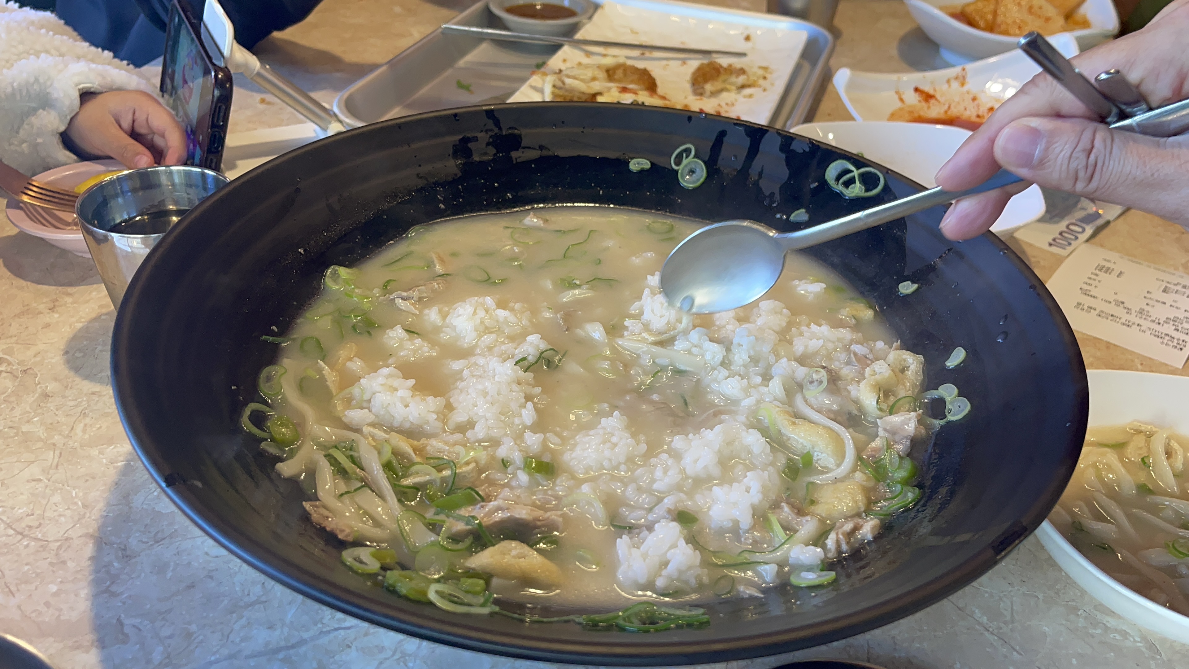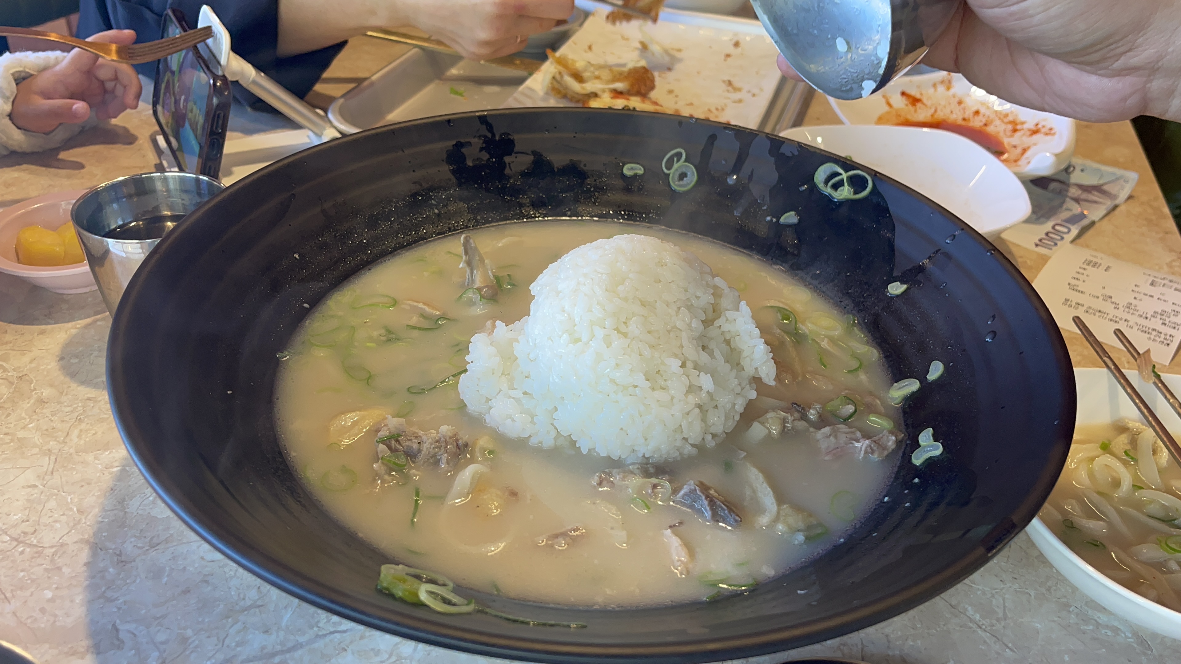 면발을 어느 정도 먹은 뒤엔 국물을 그냥 마셔버리기엔 너무 아깝단 생각이 든다. 와이프와 눈이 마주친 뒤 바로 공기밥 주문에 들어간다. 한개로는 부족하니 두개! 국물양이 많아 3,4개 말아도 될 정도..