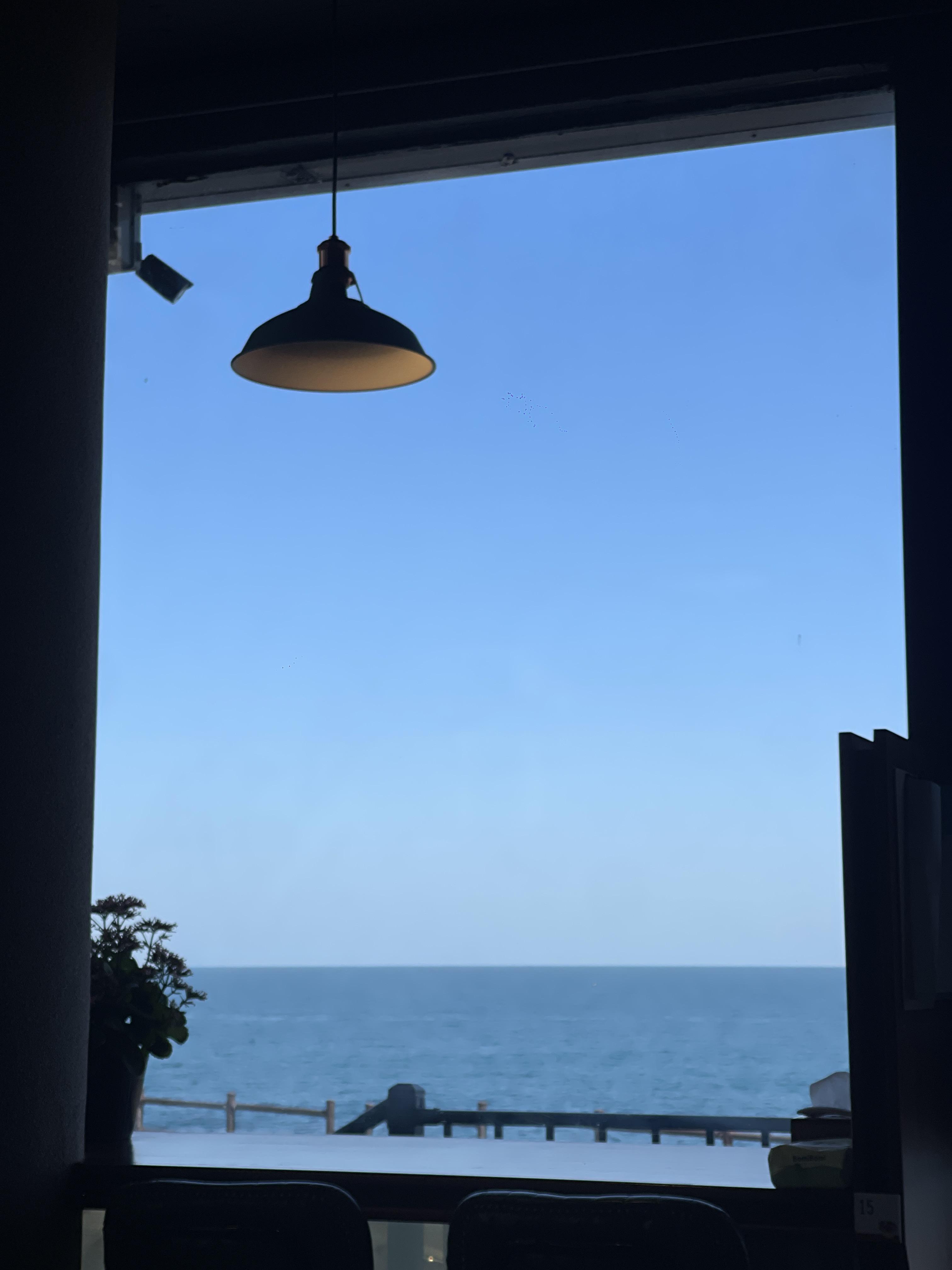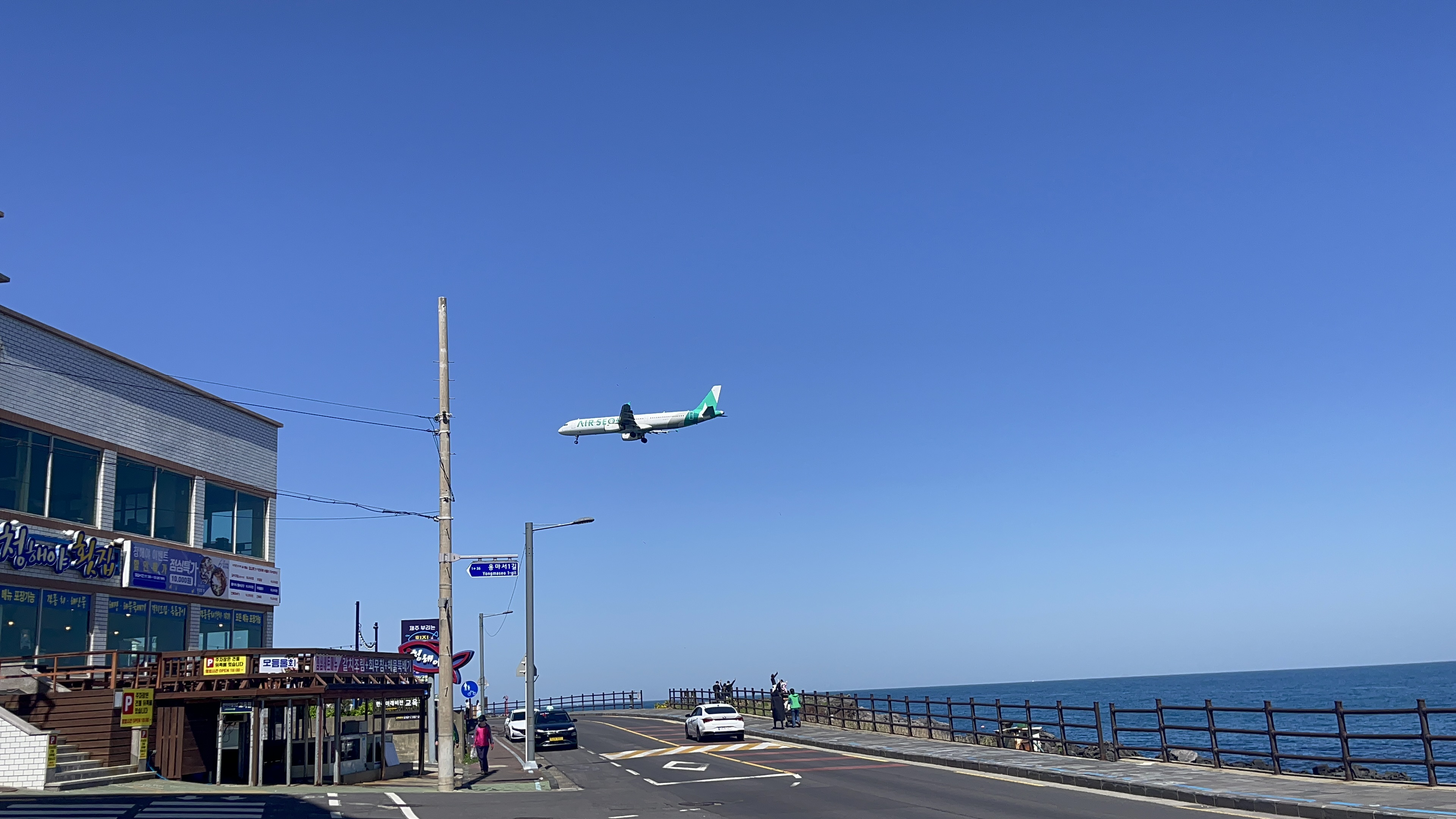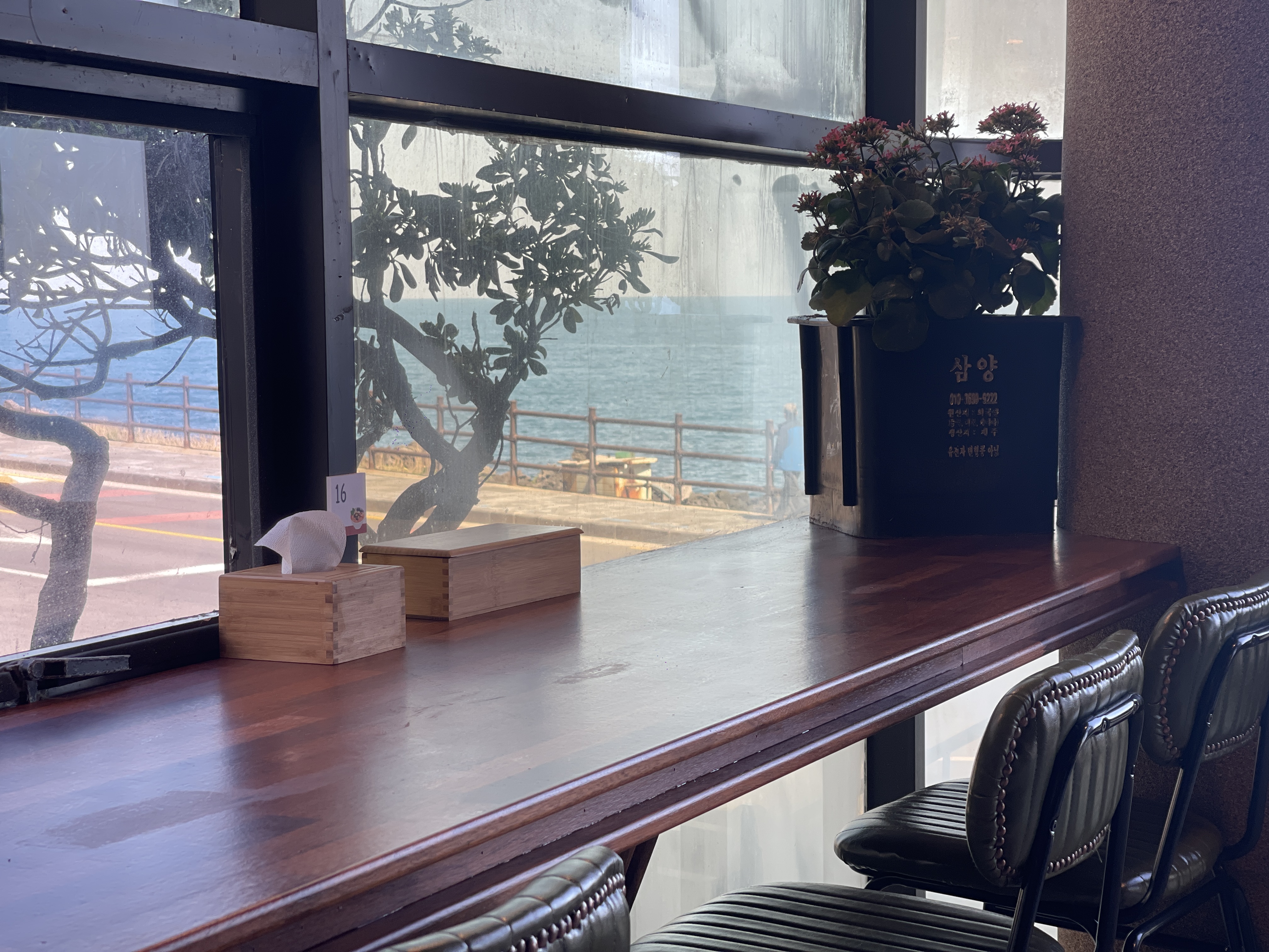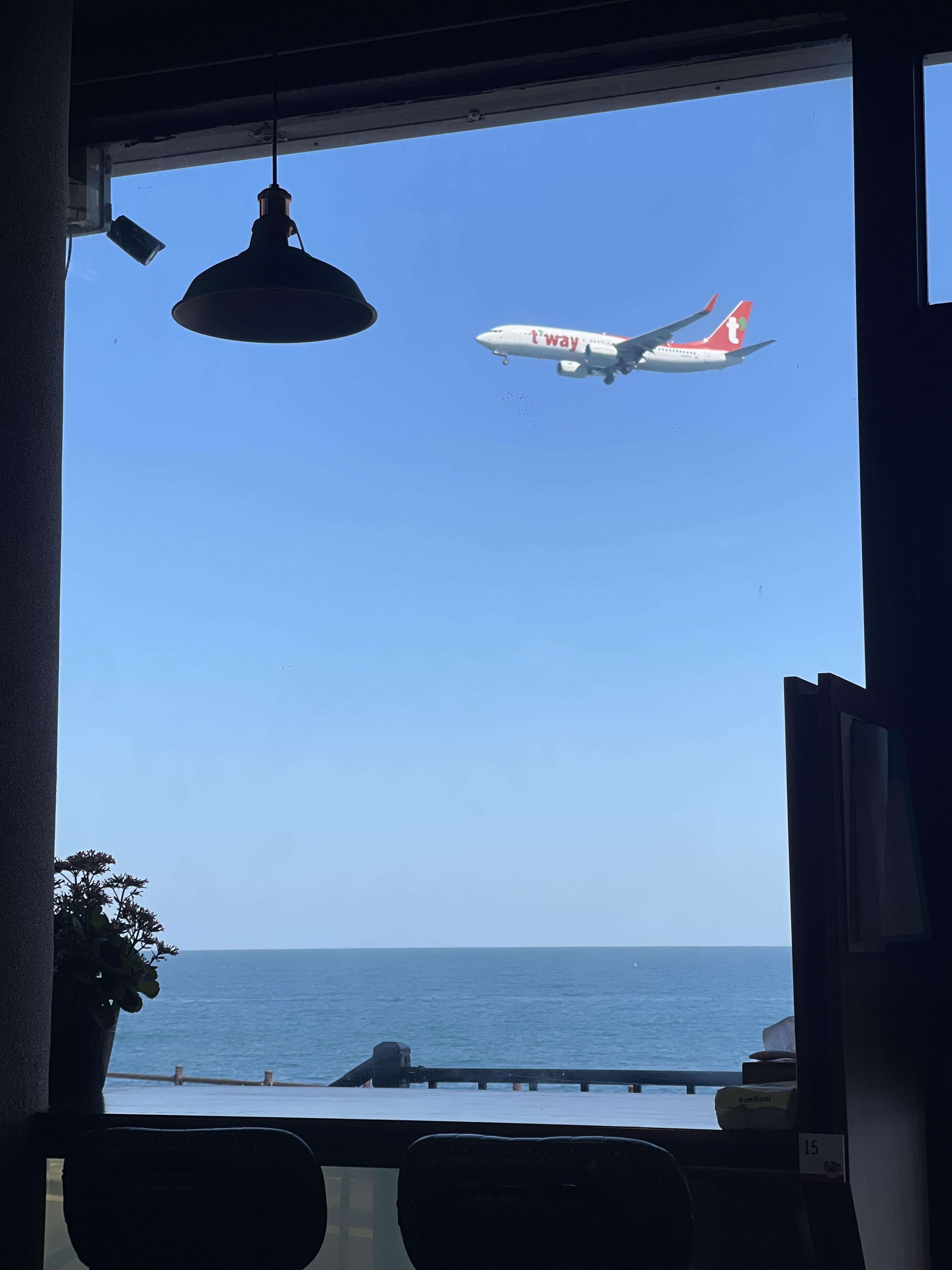 내부 인테리어는 갓 오픈한 매장인 듯 깔끔하다. 특히 바다가 바로 보이는 해안도로에 위치해 있어, 따뜻한 제주의 햇살이 창으로 들어오는 자연채광이 좋고, 혼밥좌석에서 보이는 창가뷰도 참 좋다. 그리고 타이밍만 잘 맞추면 착륙하는 비행기를 한폭의 그림처럼 볼 수 있다.