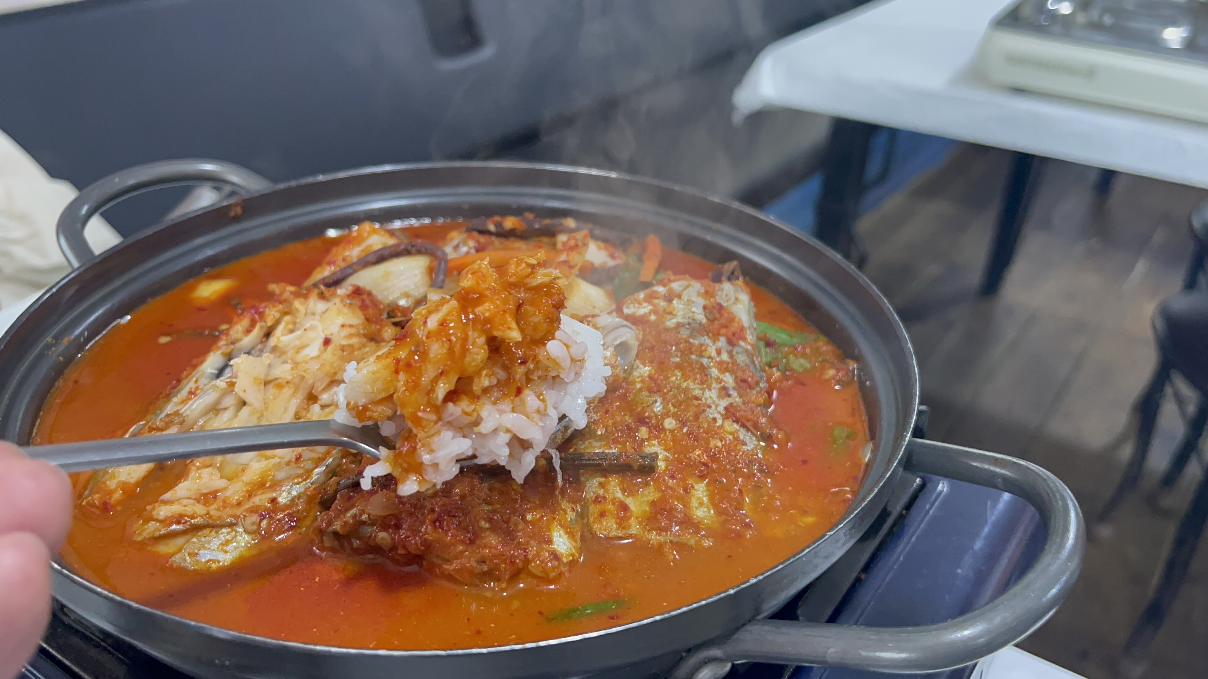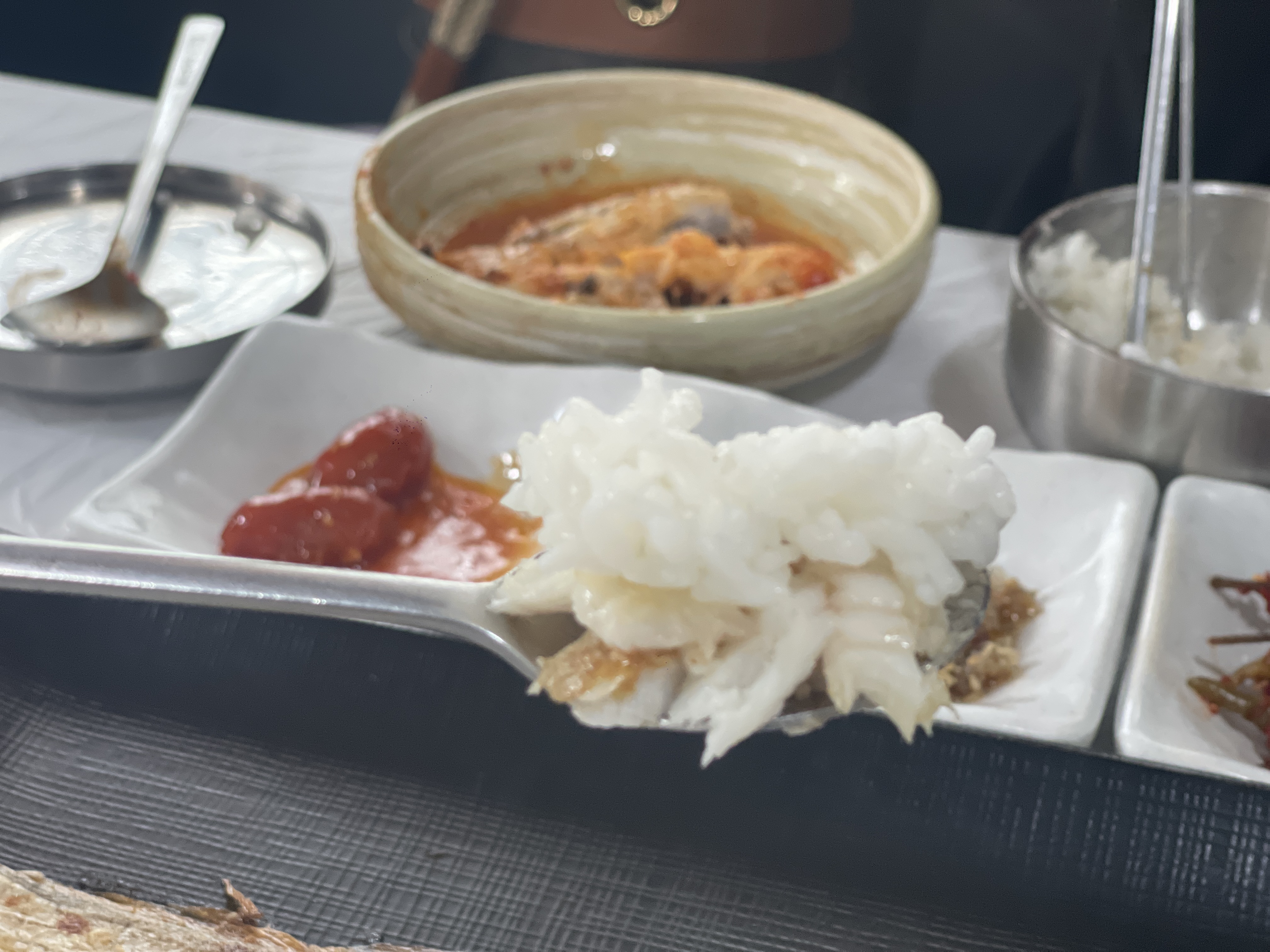 갈치구이의 갈치보다는 확실히 더 두툼한 살집이 느껴진다. 그리고 양념이 쏙 베어있는데, 양념국물 맛이 진짜 미쳤다. 적당한 매콤함과 얼큰함. 비릿한 맛이 살짝 날만도 한데, 조리를 정말 잘한 탓인지 비린내가 없다.