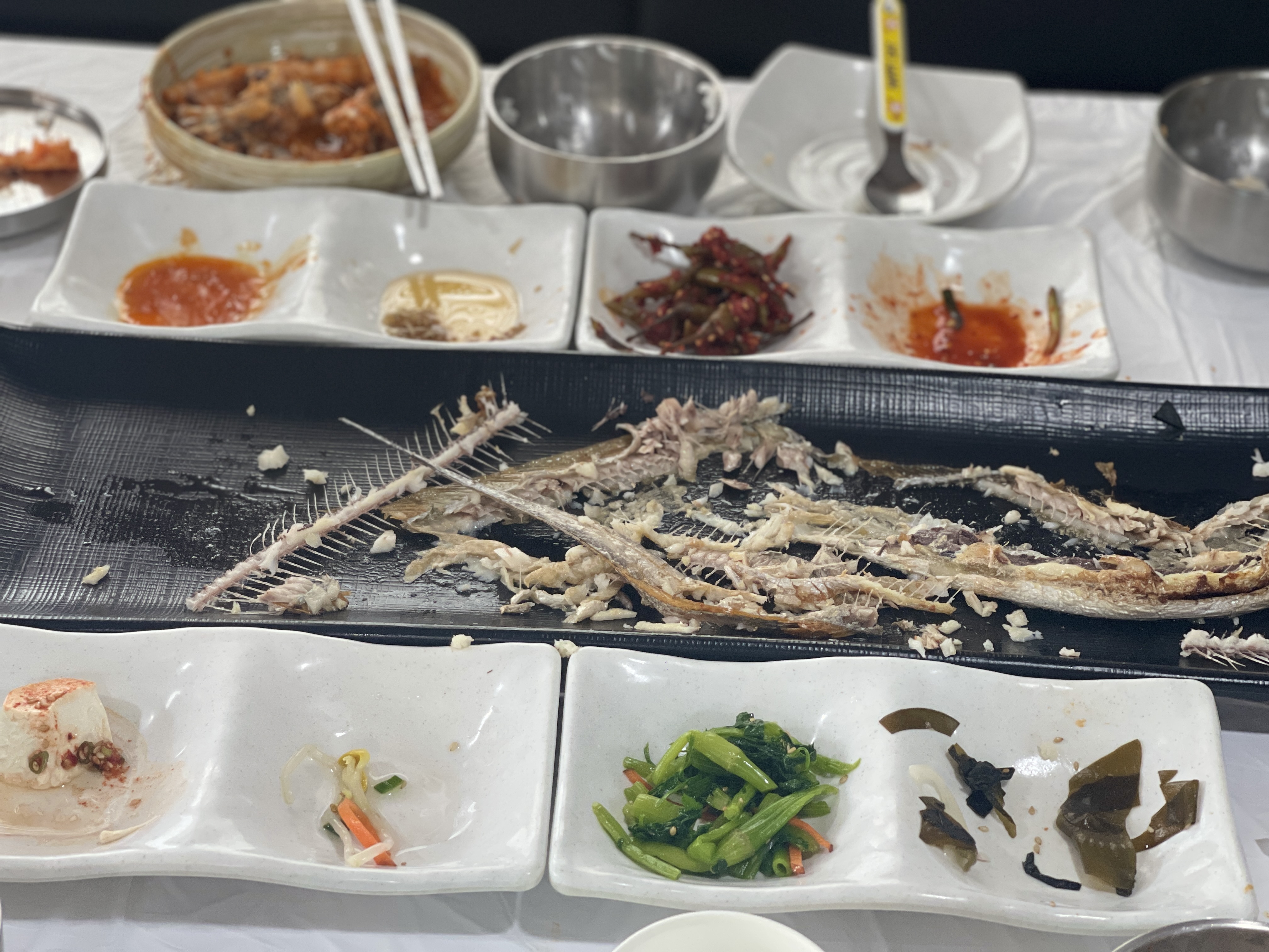 초토화된 갈치한상 위엔 갈치구이 뼈 잔해와 텅빈 조림냄비.. 그리고 밥공기 세개만 남아있을 뿐..