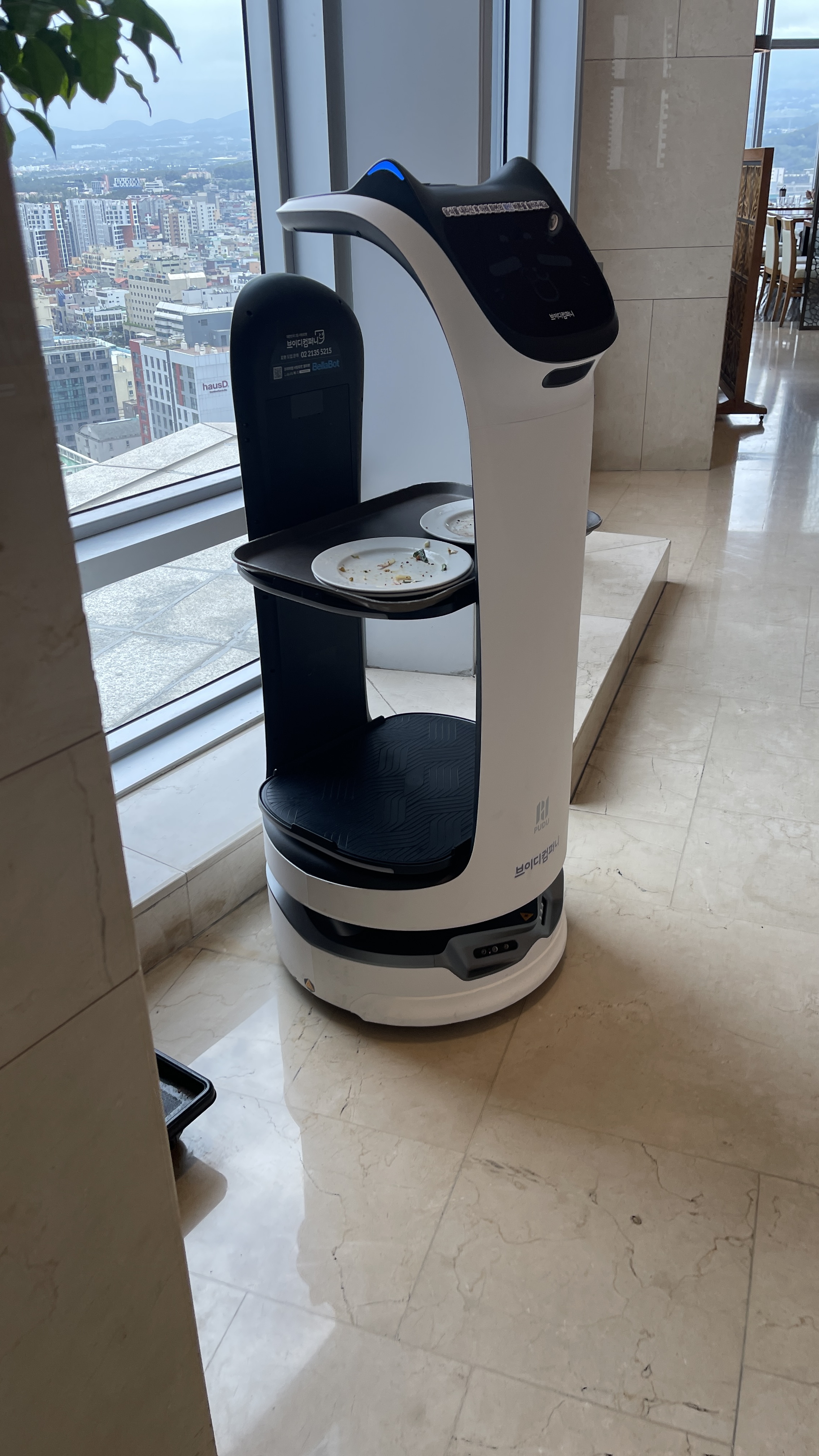 씨카페의 빈접시는 로봇이 수시로 돌아다니면서 수거하게끔 되어 있는데, 테이블마다 부착되어 있는 버튼을 누르면 저녀석이 자리까지 온다. 하지만 불성실하게 근무하는터라 직원이 직접 가지고 가는 경우가 더 많다.