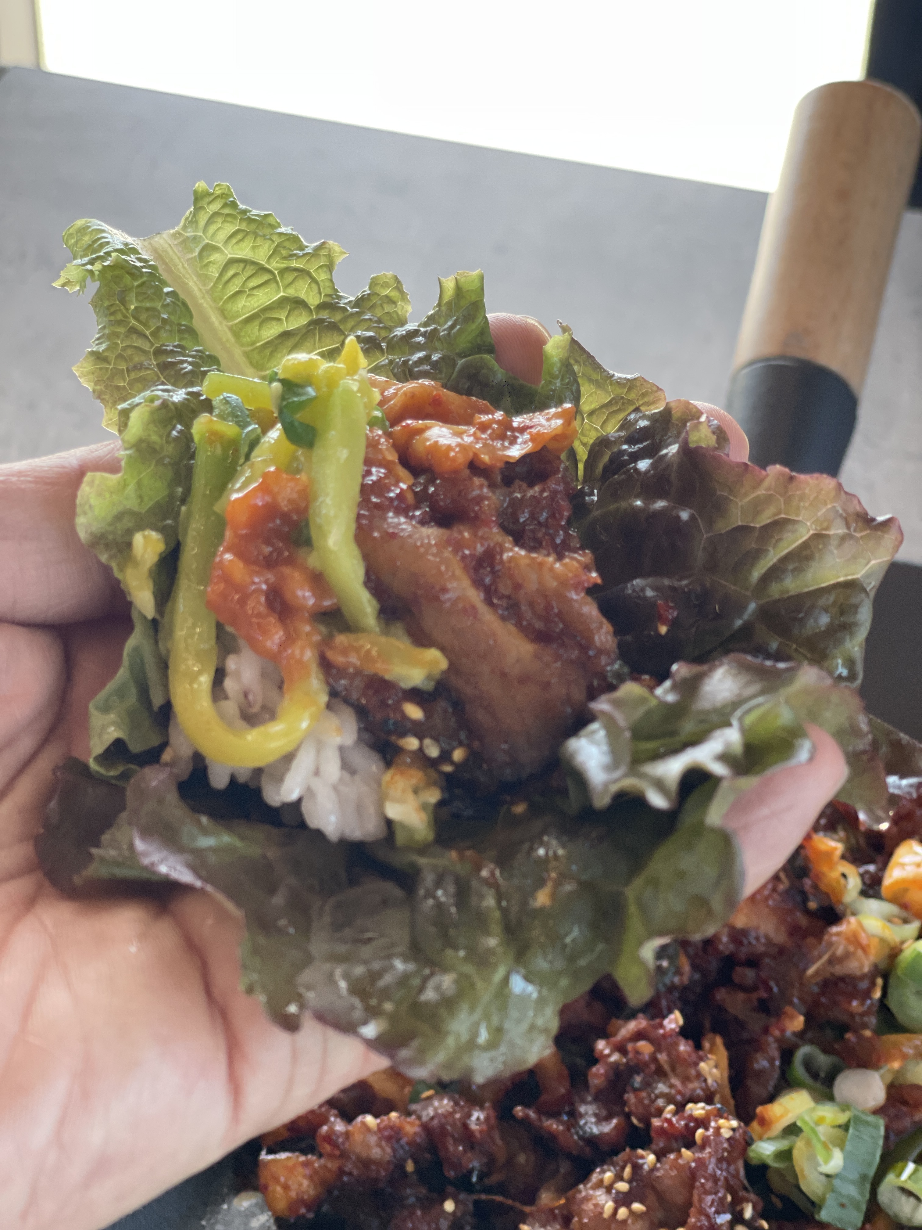 제육볶음을 쌈싸서 먹는 맛이 정말 좋다. 몇번이고 싸먹다가 밑반찬들도 곁들여서 싸먹어보는데, 그냥 맛있다. 말로 표현하기 힘든 맛있음이 계속 입안으로 들어오는 기분이다.