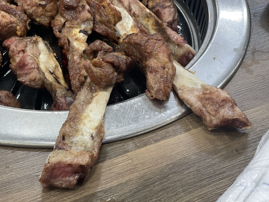 불판 위에 오르지 못한 여분의 등갈비. 뼈대도 큼직하지만 초벌구이된 등갈비엔 살도 엄청 많이 붙어 있다. 뼈갈비 4대가 1인분 정도의 분량이 되는 것 같다. 각 테이블마다 3명이 앉아있었고, 오늘의 주문은 각 테이블마다 등갈비 3인분 + 웰빙탕 2인분