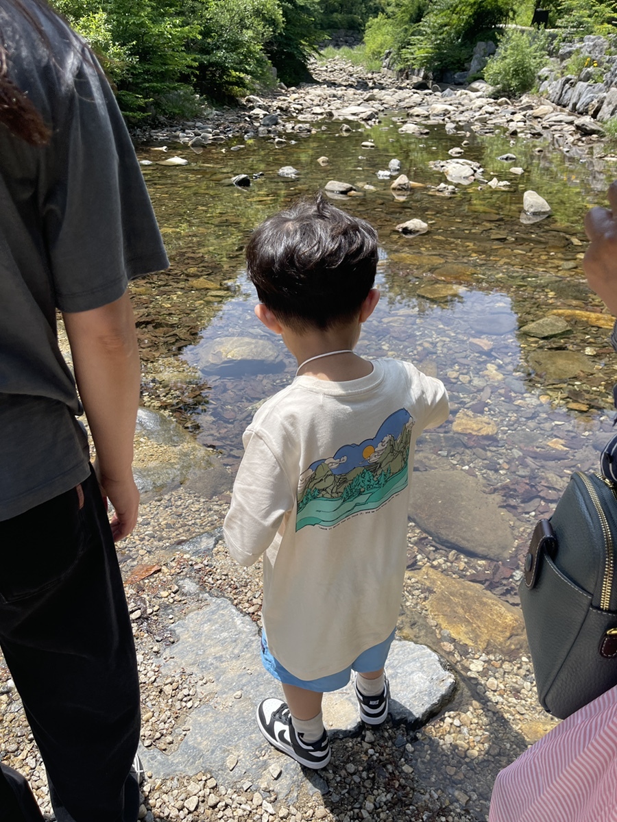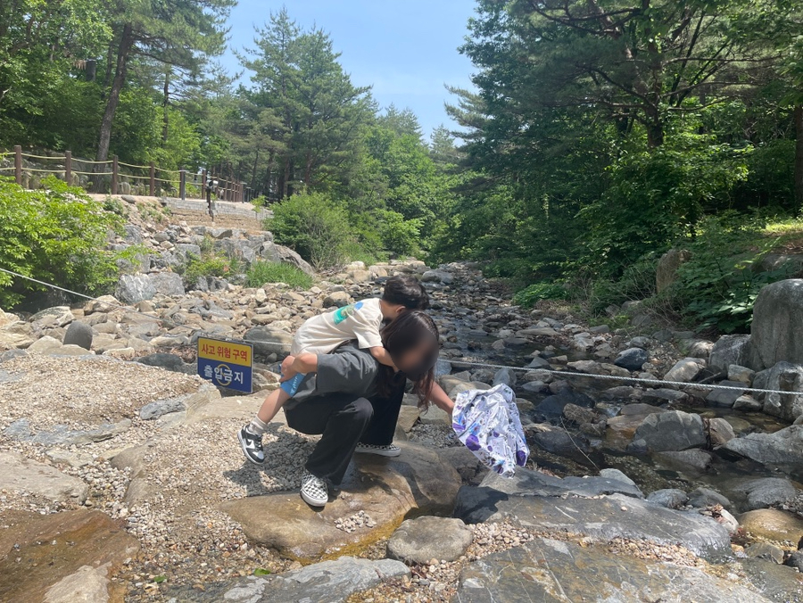 청정지역이다 보니 물이 맑을 수 밖에 없다. 오늘은 수량이 많지 않은 편이라 그냥 건널 수 있지만, 라온이가 건너기엔 살짝 무리! 고모가 업고선 지나간다고 하니 마냥 좋은 녀석.