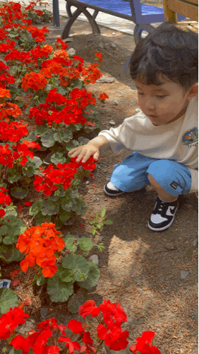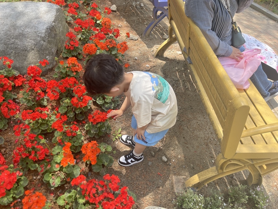 쉬고 있던 벤치 뒤에 빨간 꽃들이 피어있는 곳에 가더니 꽃봉오리를 쓰담쓰담하며. 너무 귀엽다고 한다. ㅋㅋ 그러는 네 모습이 더 귀엽다.