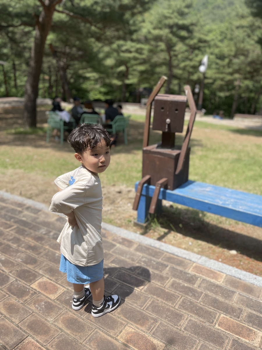 결국 왔던 길을 되돌아 나가는 우회산책을 하게 되었고, 가는 길 벤치에 놓여 있던 나무인형을 발견! 나무 인형의 모습이 웃기다며 똑같은 포즈를 취해본다. 뭐하는 건지 잘 모르겠다며 갸우뚱하는데.. 아빠도 이친구가 뭐하려고 저러는 건지 잘 모르겠다.. 벌받고 있는건가??