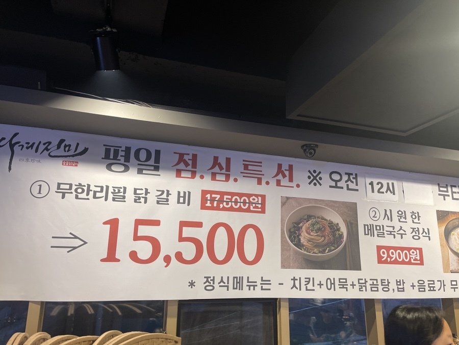 평일 점심엔 조금 더 착한 가격으로 맛볼 수 있다. 사계진미 숯불닭갈비 제주시청점의 점심특선 현수막이 돋보인다. 시간만 허락되면 평일 점심에도 제주무한리필을 저렴하게 이용해보고 싶다. 아이와 가볼만한 제주시청맛집