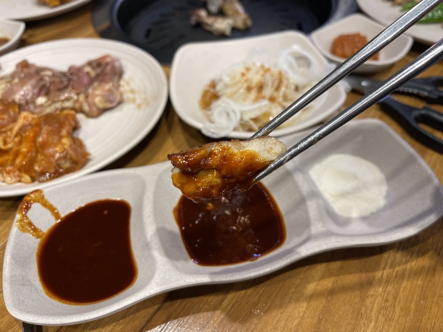 노릇하게 구운 담백하계를 일반소스에 찍먹하니, 식감도 부드럽다. 닭껍질 참 안좋아하는데 신선한 닭이라 그런가 바삭하게 구워져 무난하게 먹을 수 있어서 좋다. 이런 제주무한리필 집이 있다니 참 행복한 제주생활~