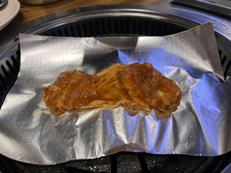 음... 화끈하계... 이름만큼이나 화끈하지는 않다. 아주 매운 소스에 한번 더 찍어먹어야 우리가 원하는 맛이 나온다. 그렇다면.. 굽기 번거로운 양념닭갈비는 패스! 담백하계로 올인!