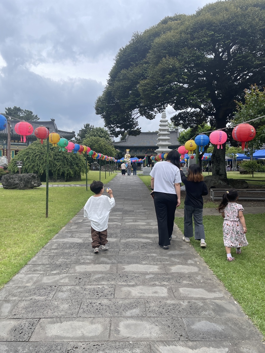 제주사찰 월정사의 전경. 눈에 보이는 것이 전부이지만, 아이와 함께하기엔 이만한 사찰도 없다. 원래 부처님오신날엔 비빔밥을 먹어줘야 하나, 이 아이들을 데리고 밥먹기란 쉬운 일은 아니라 오늘은 패스!