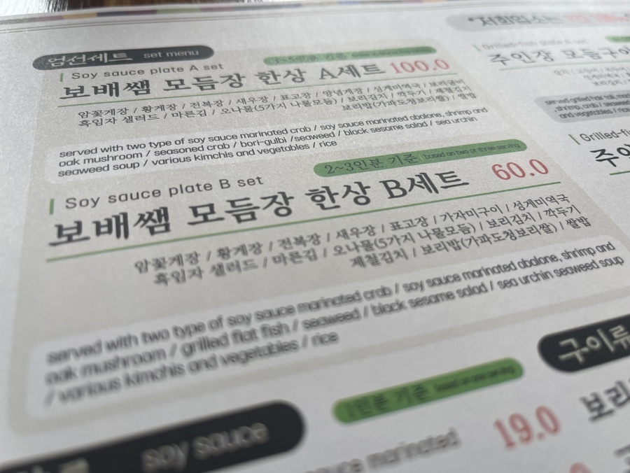 주요메뉴는 보배쌤 모듬장 한상세트(A 10만원/B 6만원), 주인장 모듬구이 한상세트(A 10만원/B 6만원)으로 구성되어 있는데, 단품메뉴도 있으니 대가족이 아니라면 세트메뉴는 조금 과해보일 수도 있을 것 같다.