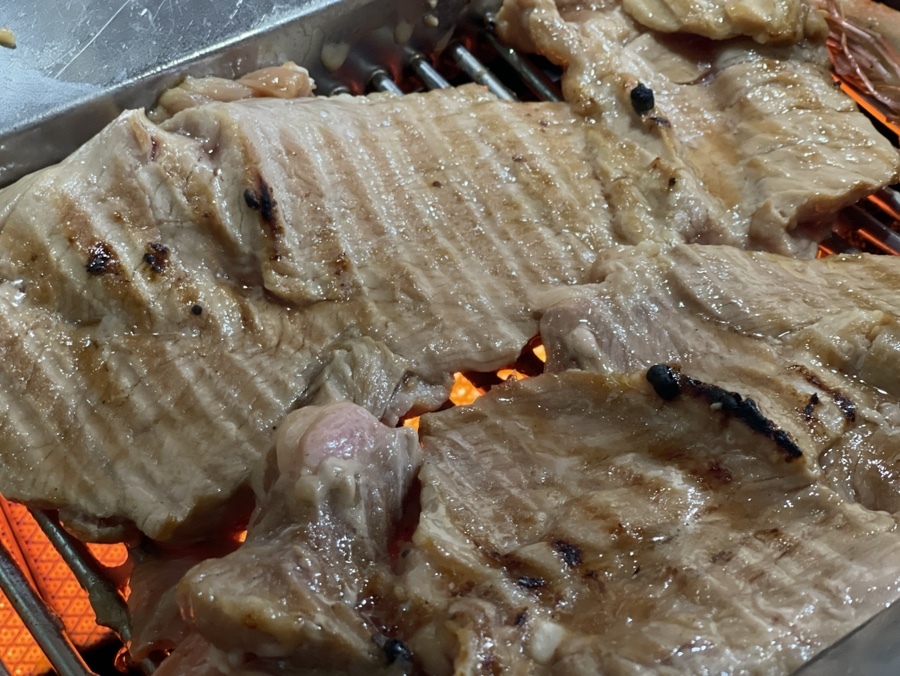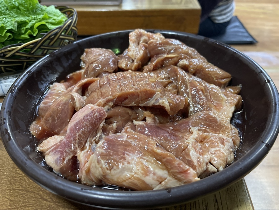 여러메뉴가 있지만 늘 그랬듯 돼지양념살로 주문한다. 엄밀히 따지면 돼지갈비가 아닌데, 돼지갈비라고 믿고 먹으면 돼지갈비가 되는 신기한 돼지양념살이다. 국내산도 아닌데 국내산인 것처럼 믿고 먹으면 국내산이 되는 신기한 돼지양념살. 항상 오늘도 우리는 돼지양념살 3대를 주문완료!