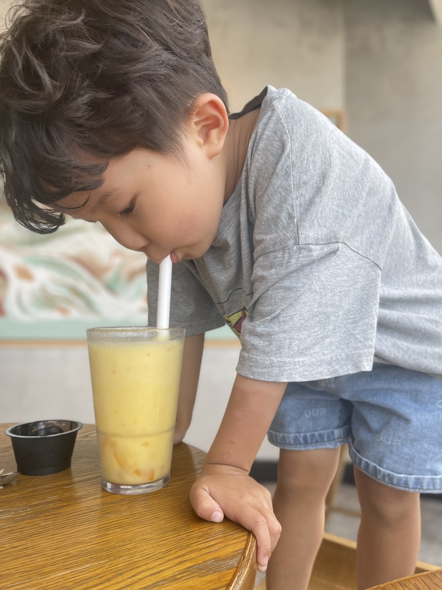 그런데 녀석, 노란빛깔의 음료가 궁금했는지, 아빠보다도 먼저 입을 댄다.