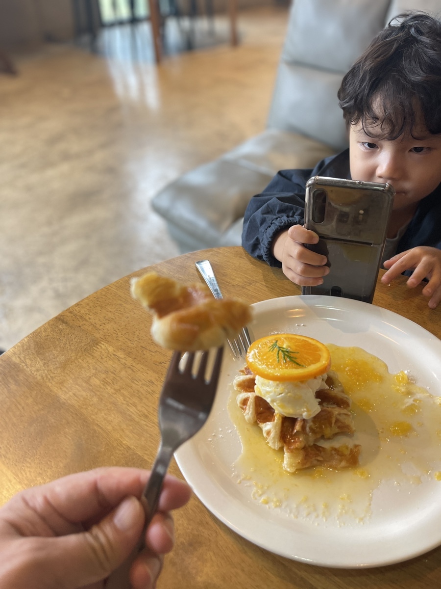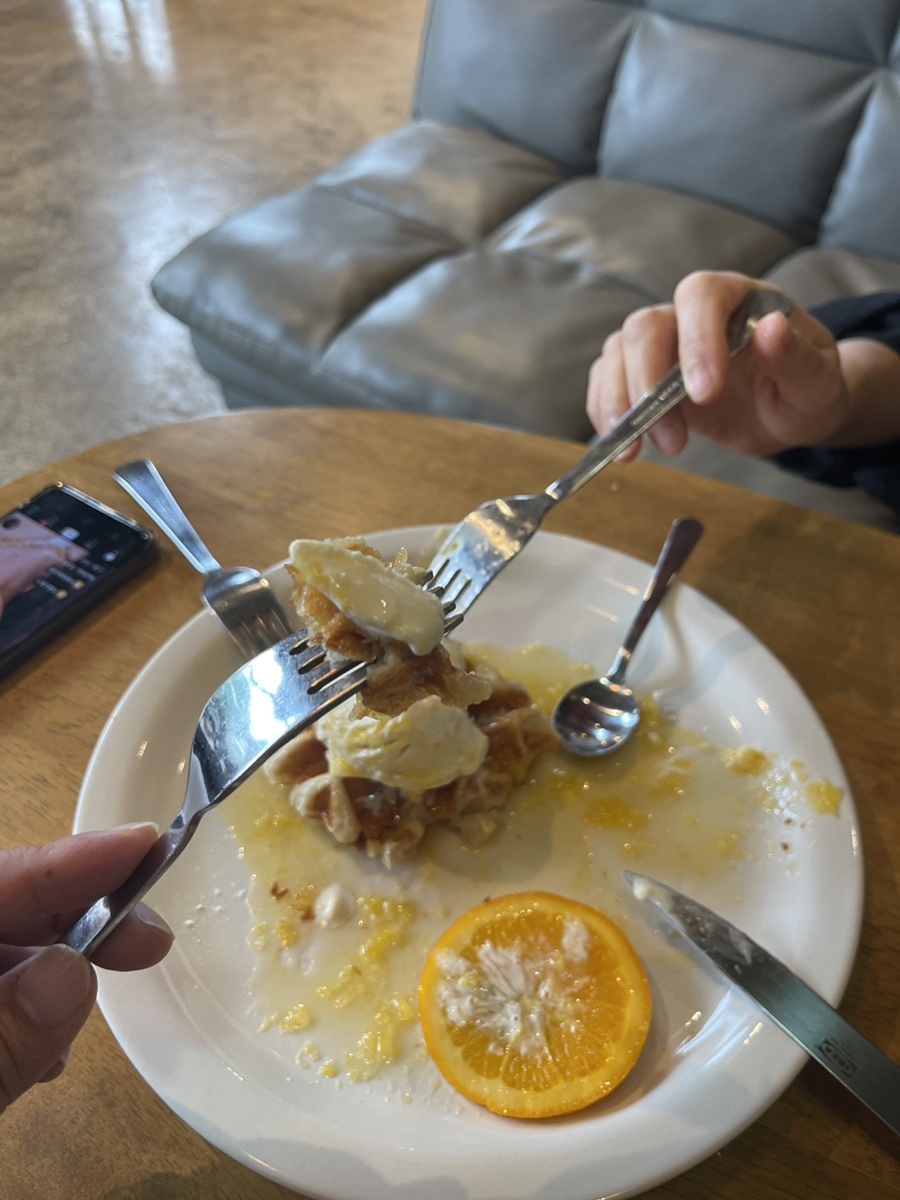 한라봉 크로플. 순삭이라는 말이 딱 맞다. 크로플이 바삭고소한데다 여기에 새콤한 한라봉시럽이 맛을 업그레이드 시켜주니 라온이의 입에도 최고인 맛이 탄생! 아이도 엄지척! 어른도 엄지척! 하는 맛이다.