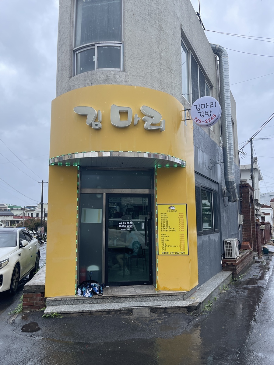 후기에서도 보았던 노란색 간판이 반겨주는 김마리. 먹고 갈까 싶었는데, 주변 주차가 너무 어렵다. 포장만 해서 가야할 것 같다.
