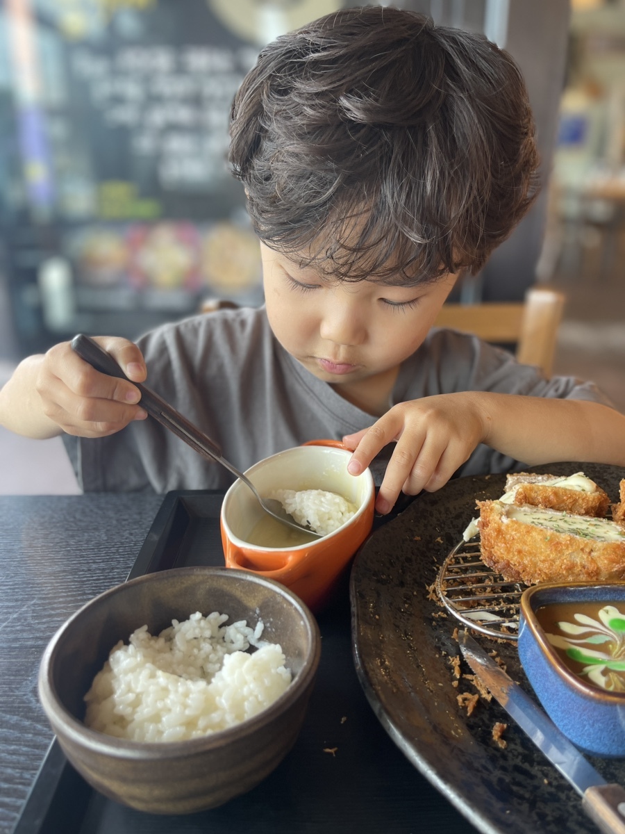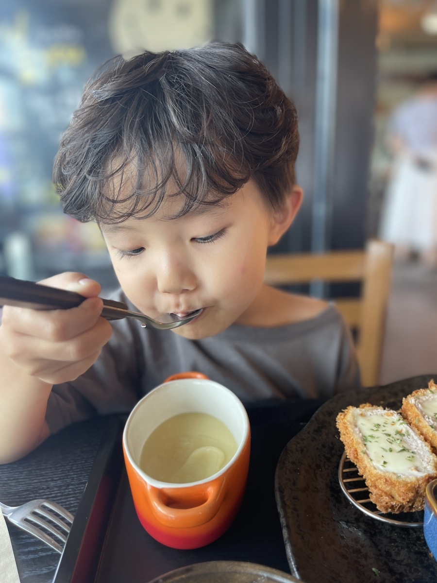 스프를 먼저 맛보던 라온이는 너무 맛있다며 계속 먹는다. 스프에 홀릭되어 돈까스는 한참이나 뒤늦게 반응을 보이기도 했다.