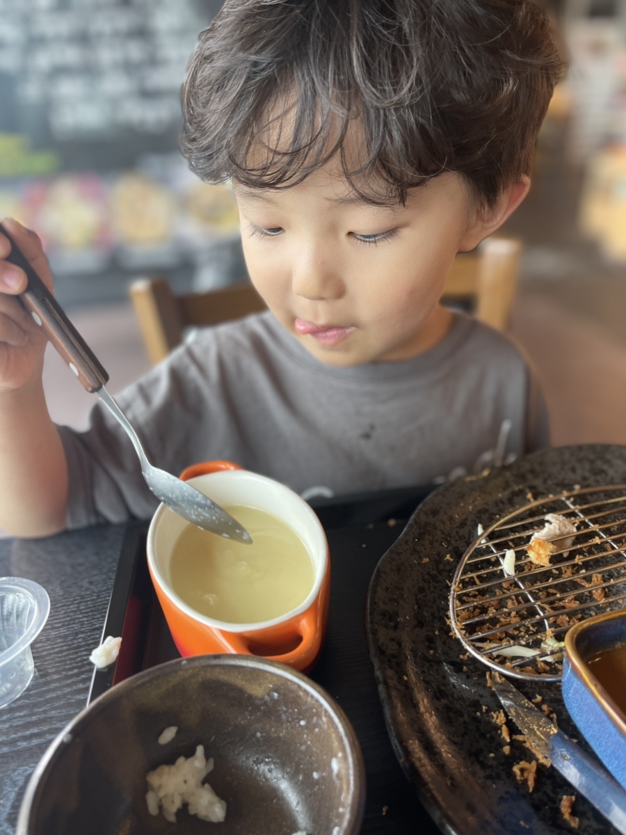 매콤소스에 식겁을 한 뒤엔 갑자기 스프로 갈아타더니 이번엔 밥과 스프를 같이 먹는다. 자기 딴에는 매콤한 소스를 중화시켜보려고 시작한 것 같은데...