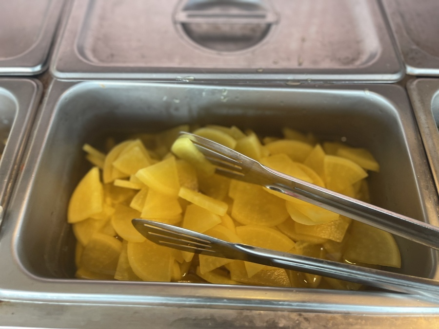 셀프반찬대엔 마카로니 샐러드와 단무지 그리고 흔들린 김치가 있다.^^