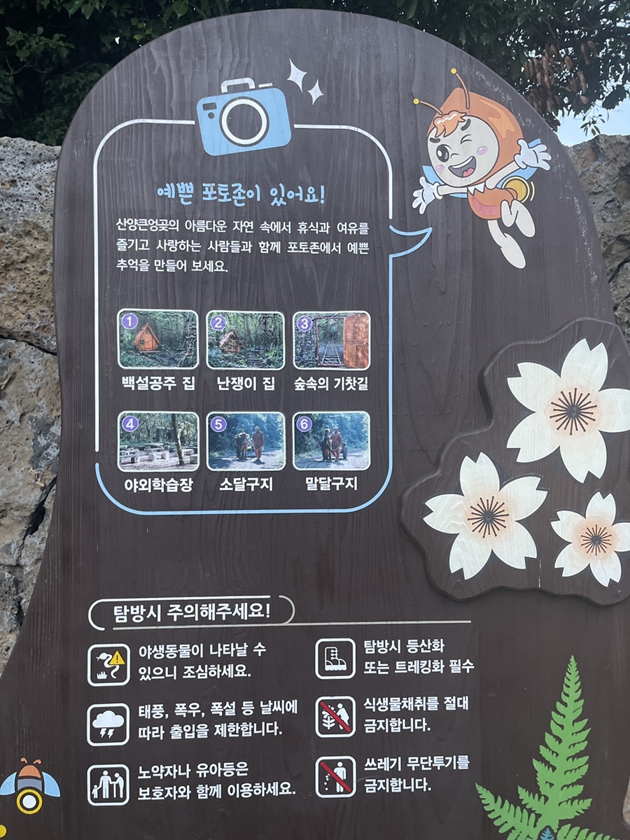 낮에 관람해도 참 좋은 산양큰엉곶. 숲속의 요정들이 사는 컨셉으로 백설공주와 난장이들이 당장에라도 튀어나올 것처럼 잘 꾸며 놓았다. 포토존도 많아서 아이사진 찍기도 좋고 특이한 식물들도 자라고 있어 유아 숲체험이나 생태학습으로 참 좋다. 피톤치드 뿜뿜하는 산책로는 힐링코스로 제격이라 연인, 가족여행에도 참 좋은 장소이다.