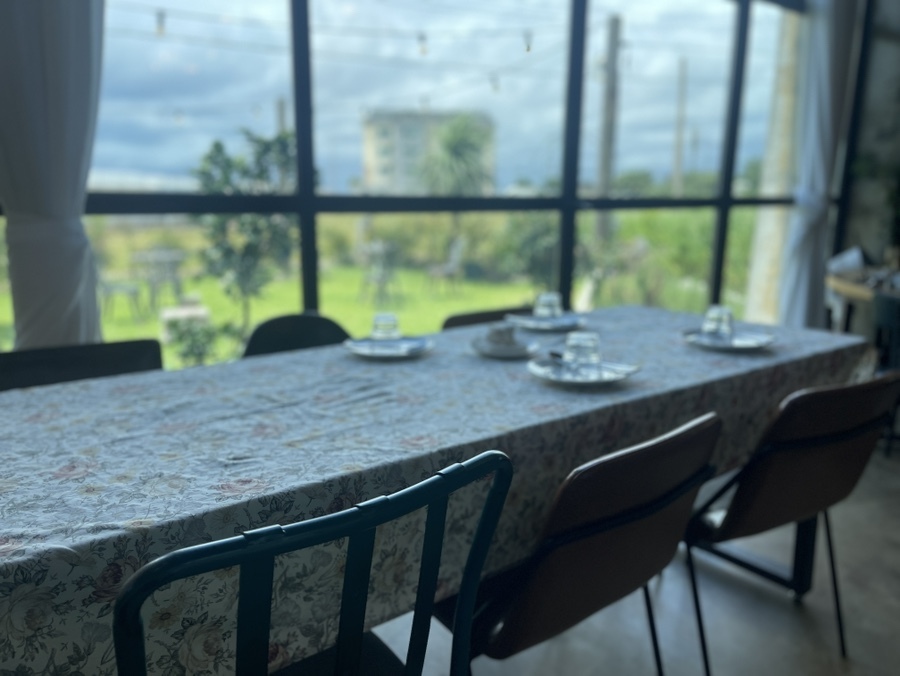테이블엔 컵과 접시 수저세트가 기본으로 세팅.