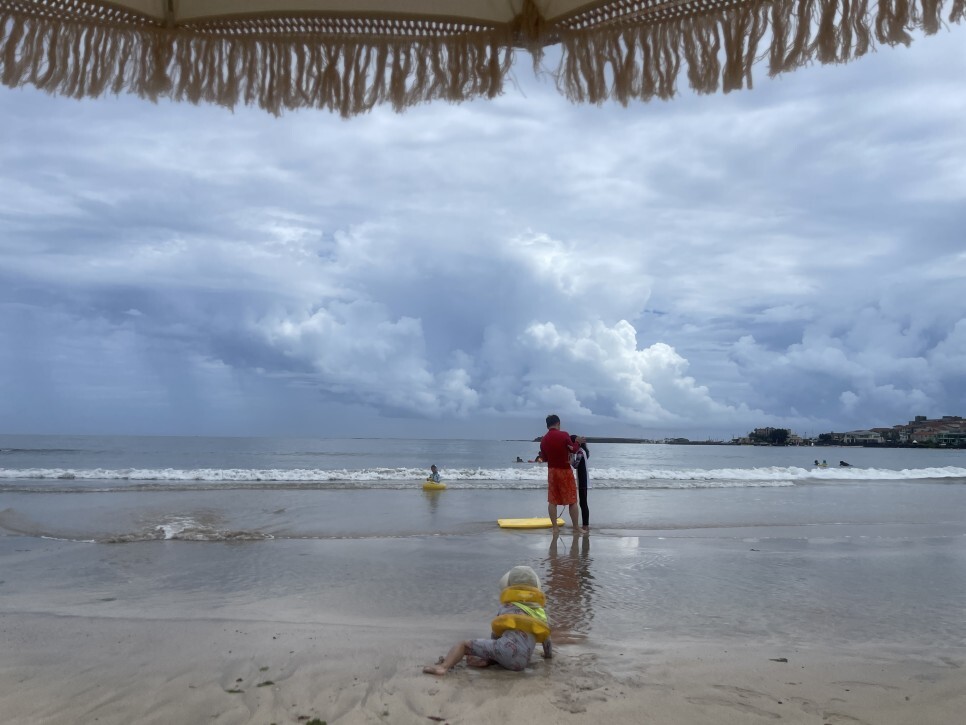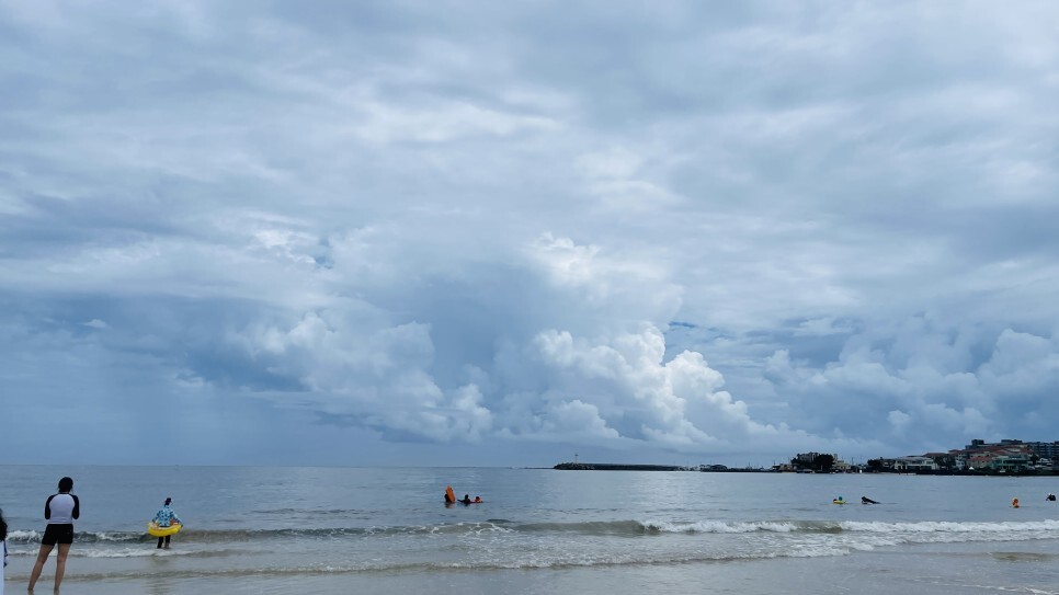 역시나 서귀포의 날씨는 제주시보다 좋다. 표선 소금막 해변을 바라보니 구름이 장관이다. 오늘 구름이 아주 열일할 것 같은 느낌! 그리고 제주시보다 맑기는 하지만 그렇다고 햇살이 강하지도 않다. 이런 날씨에 물놀이 하기 아주 좋지!!