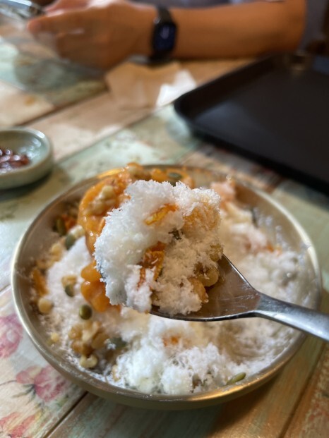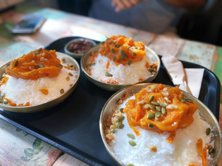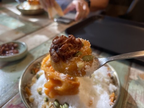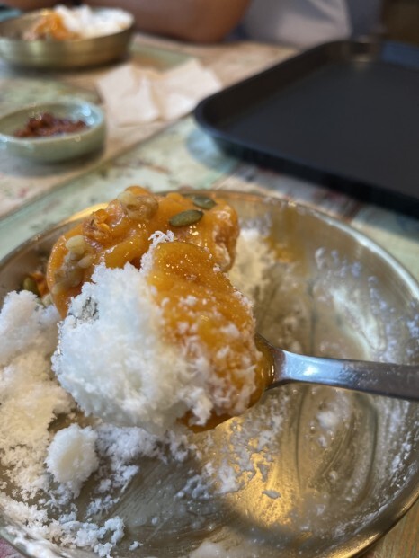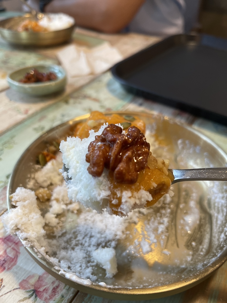 그리고 앞서얘기했던 신의 한수 호두정과를 눈꽃홍시빙수 위에 올려서 먹으면 더 맛있다. 달콤하고 고소한 호두 맛이 너무너무 좋다. 피칸파이나 호두파이의 토핑이 참 달콤하니 좋아했는데, 그런 맛이 느껴져서 빙수랑 완전 찰떡궁합!