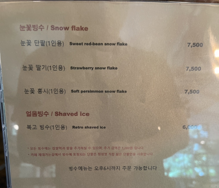 오늘의 시그니처 메뉴가 되는 것은 눈꽃빙수! 그리고 지금 시즌엔 눈꽃 홍시가 제철을 맞았다고 한다. 이밖에 단팥, 딸기 종류도 있고 복고스타일의 팥빙수도 준비되어 있다. 보통 1만원 이상하는 빙수가 넘쳐나는 요즘에 이 정도 가격이면 완전 착하다.