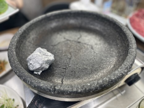 호일이 올려져있어서 뭔가 했는데 안에 기름 덩어리가 있다. 불판이 데워지면 호일 안에서 기름이 녹아나와 불판을 반질반질하게 만들어 준다.