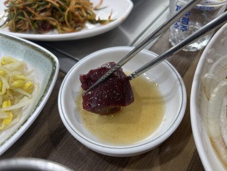 깍둑썰기스타일로 엄청 큼지막하게 잘려나온 생간.. 기름장에 찍어먹으면 존맛!