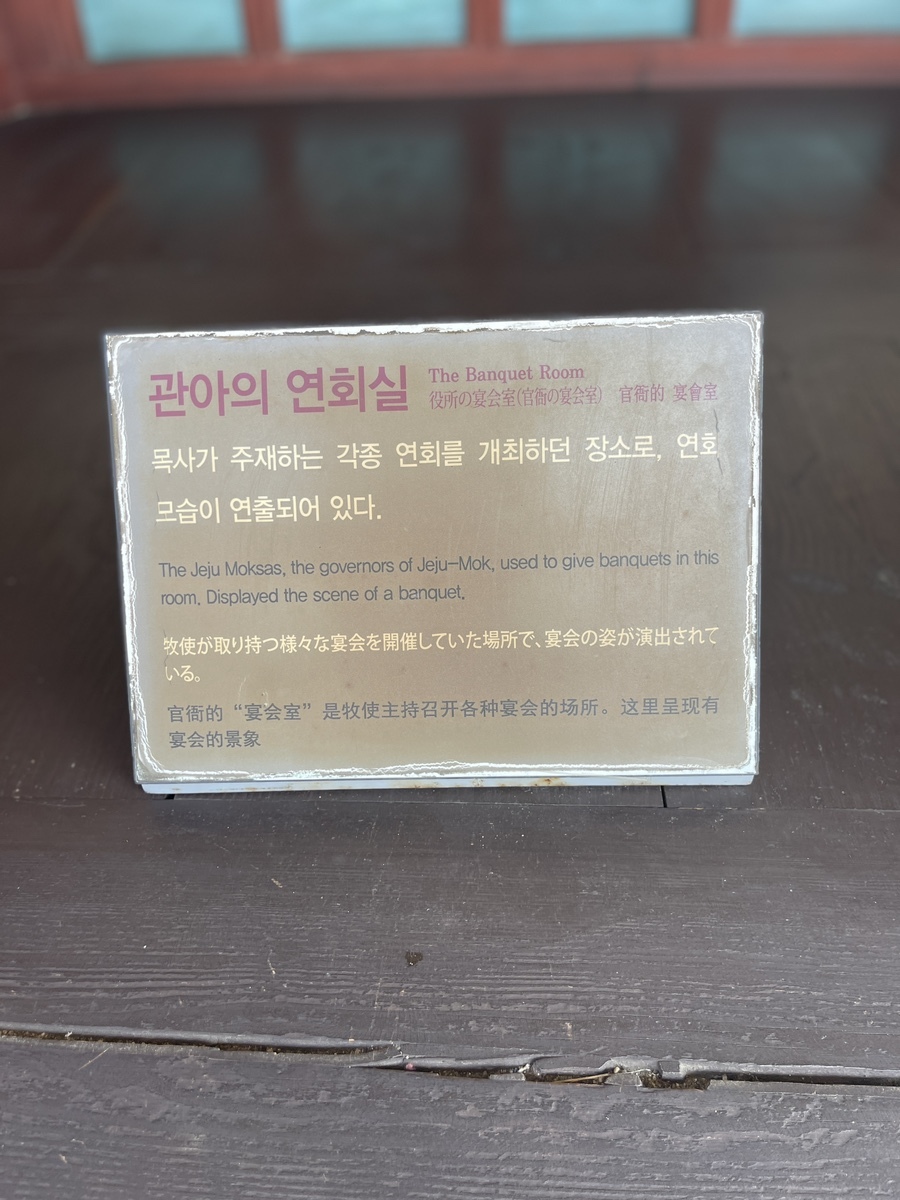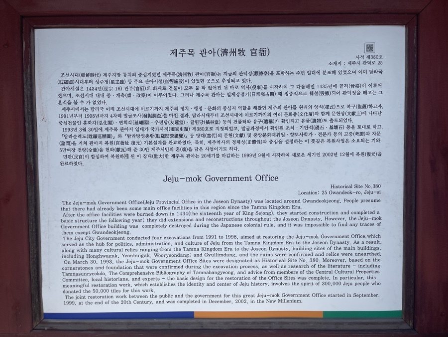 조선시대 제주목 관아의 건물터에 지금의 관아를 재현해 놓은 역사유적이다. 얼마 전 제주방송에서도 한번 보긴 했지만 일제시대 때 완전 훼손되어 형체도 없다가 1991년부터 4차례의 발굴조사를 거쳐 탐라국에서부터 조선시대의 관아터까지 다양한 문화층이 발견되었다고 한다. 제주에 있어서 꽤 중요한 사적지인 것은 분명하다.[참고 : 네이버 지식백과]