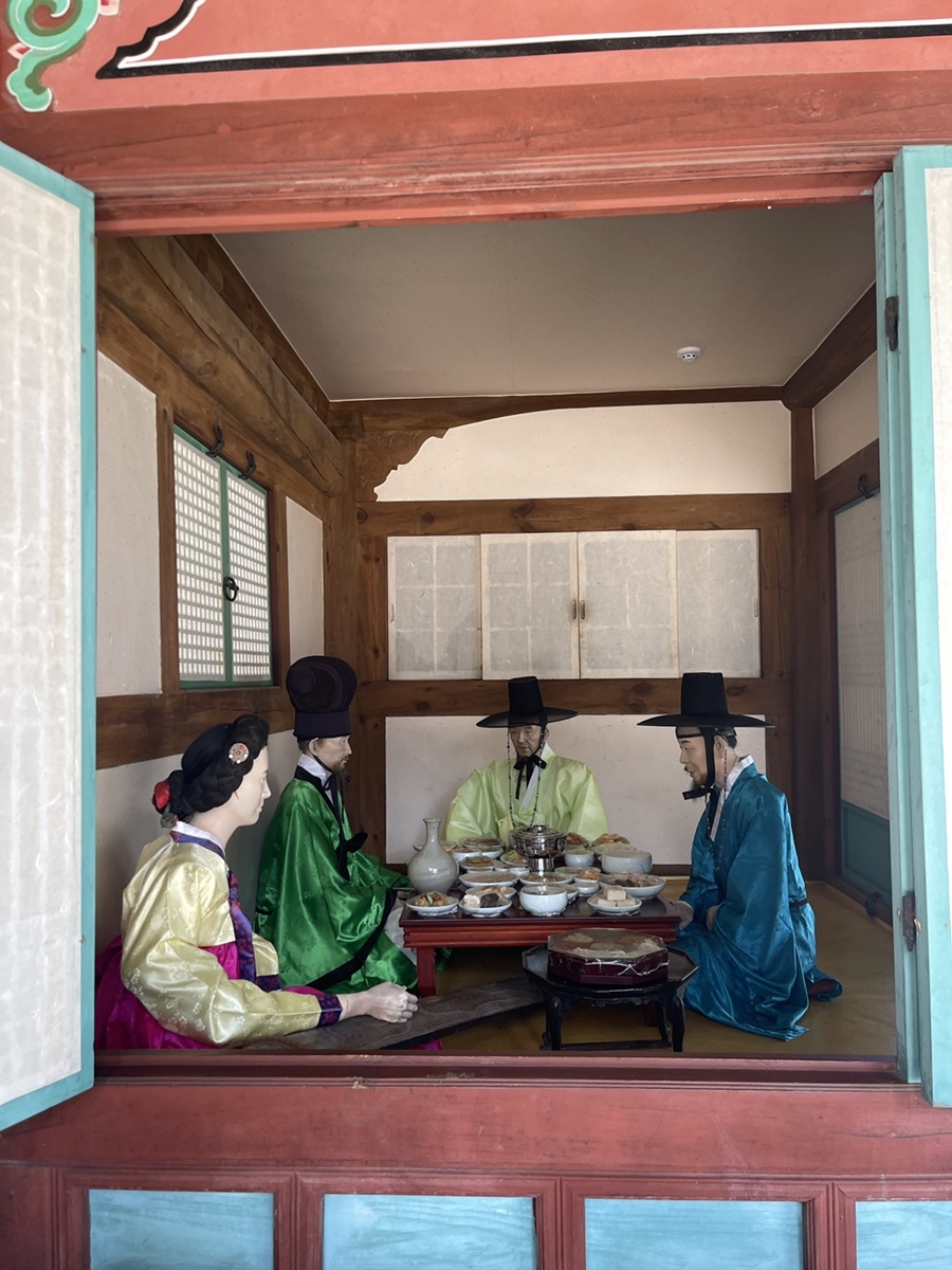 우련당이 연회를 하던 곳이라 밀랍인형들이 잔치를 벌이고 있으니 그 모습이 신기해서 이것저것 물어보는 녀석