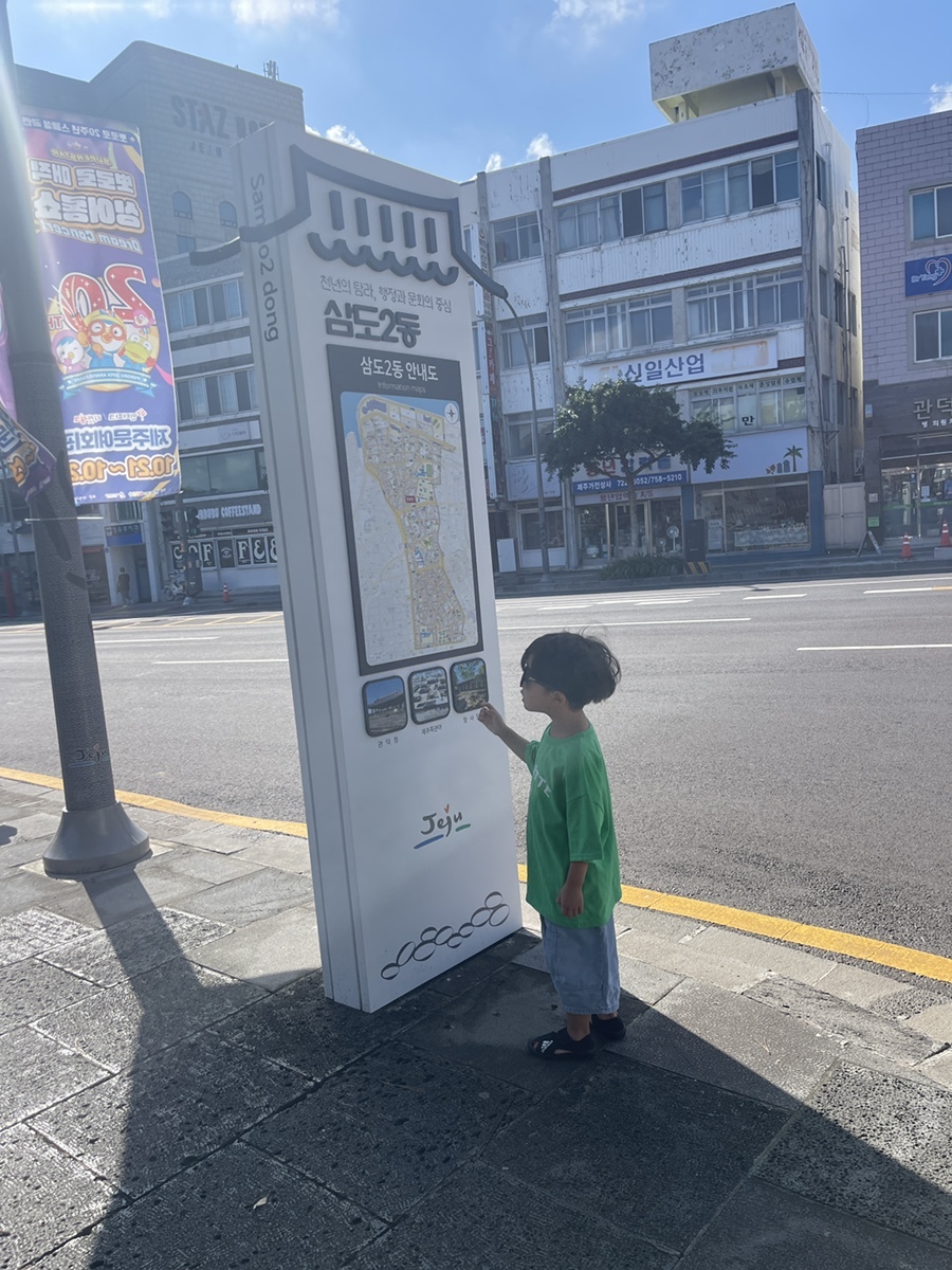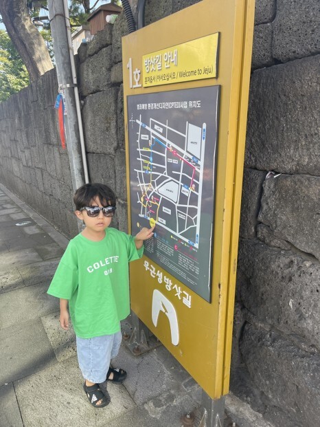 관덕정 옆에 있는 지도들을 일일이 훑어보며 자신이 어디에 있는지 어디로 가는지를 확인하는 아이.